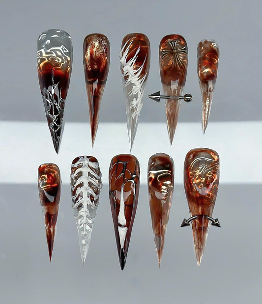 This avant-garde press-on set features a striking palette of obsidian black, blood red, and stark...