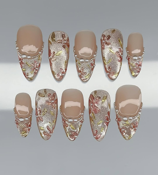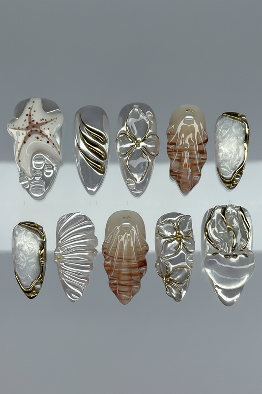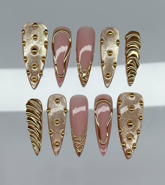 This elegant short press-on set features a sophisticated palette of soft nude and shimmering champagne...