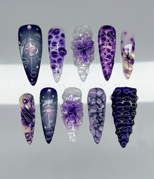 This avant-garde collection features a mesmerizing palette of deep midnight purple and translucent lavender, creating...