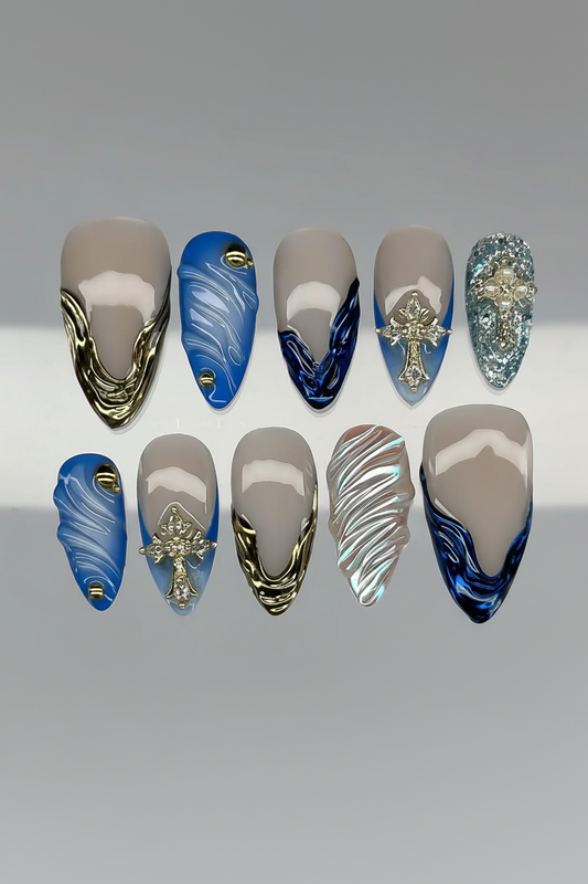 This avant-garde short press-on set features a captivating palette of deep turquoise and luminous cerulean,...