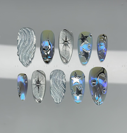 This avant-garde short press-on set features a high-shine silver chrome palette with mesmerizing iridescent blue-to-purple...