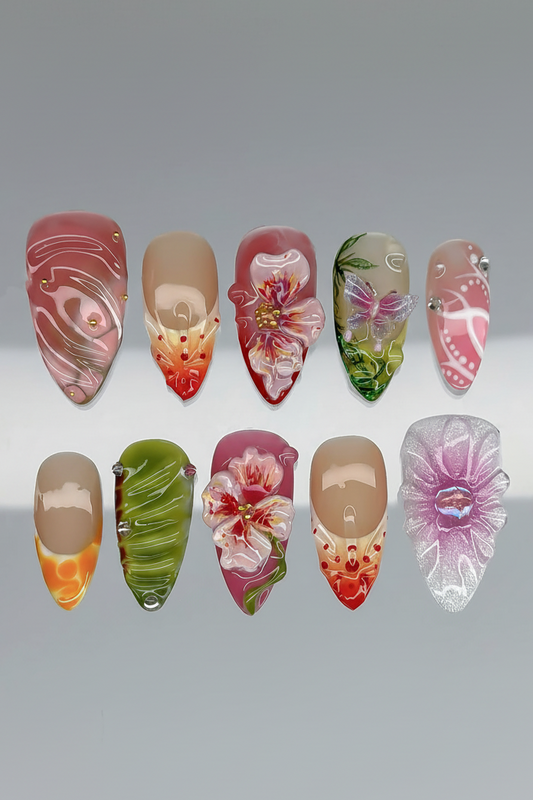 This enchanting press-on set features a vibrant palette of deep hibiscus red, forest green, and...