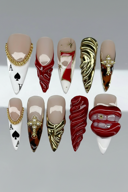 This playful short press-on set features a nostalgic palette of ivory cream, carnival red, and...