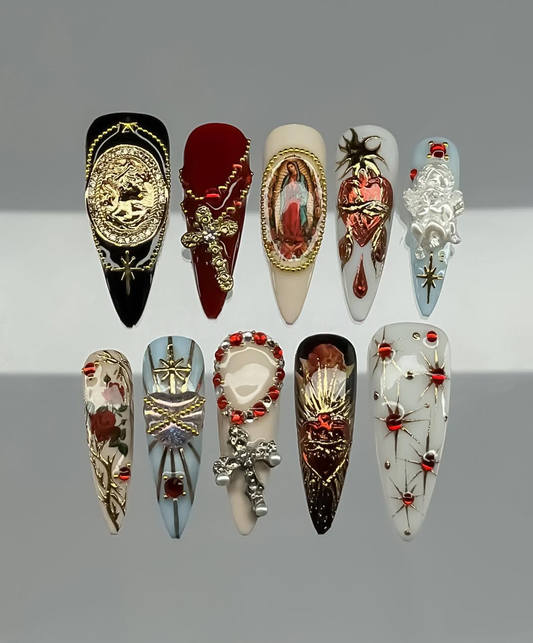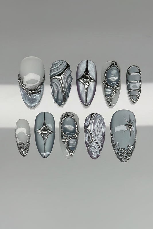This striking press-on set features a powerful palette of deep navy blue and iridescent azure,...