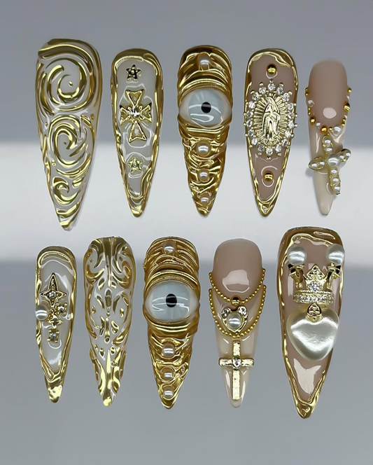 This opulent collection features a sophisticated palette of creamy nude and radiant gold, creating a...