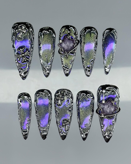 This avant-garde set features a mesmerizing palette of deep midnight purple and shimmering iridescent violet,...