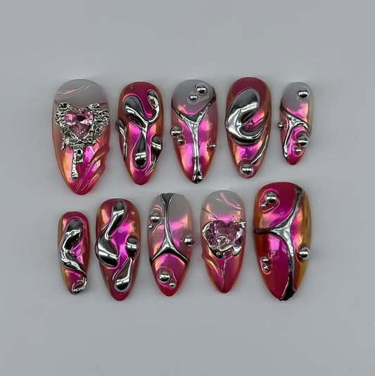 This avant-garde short press-on set features a breathtaking palette of glowing fuchsia, molten orange, and...