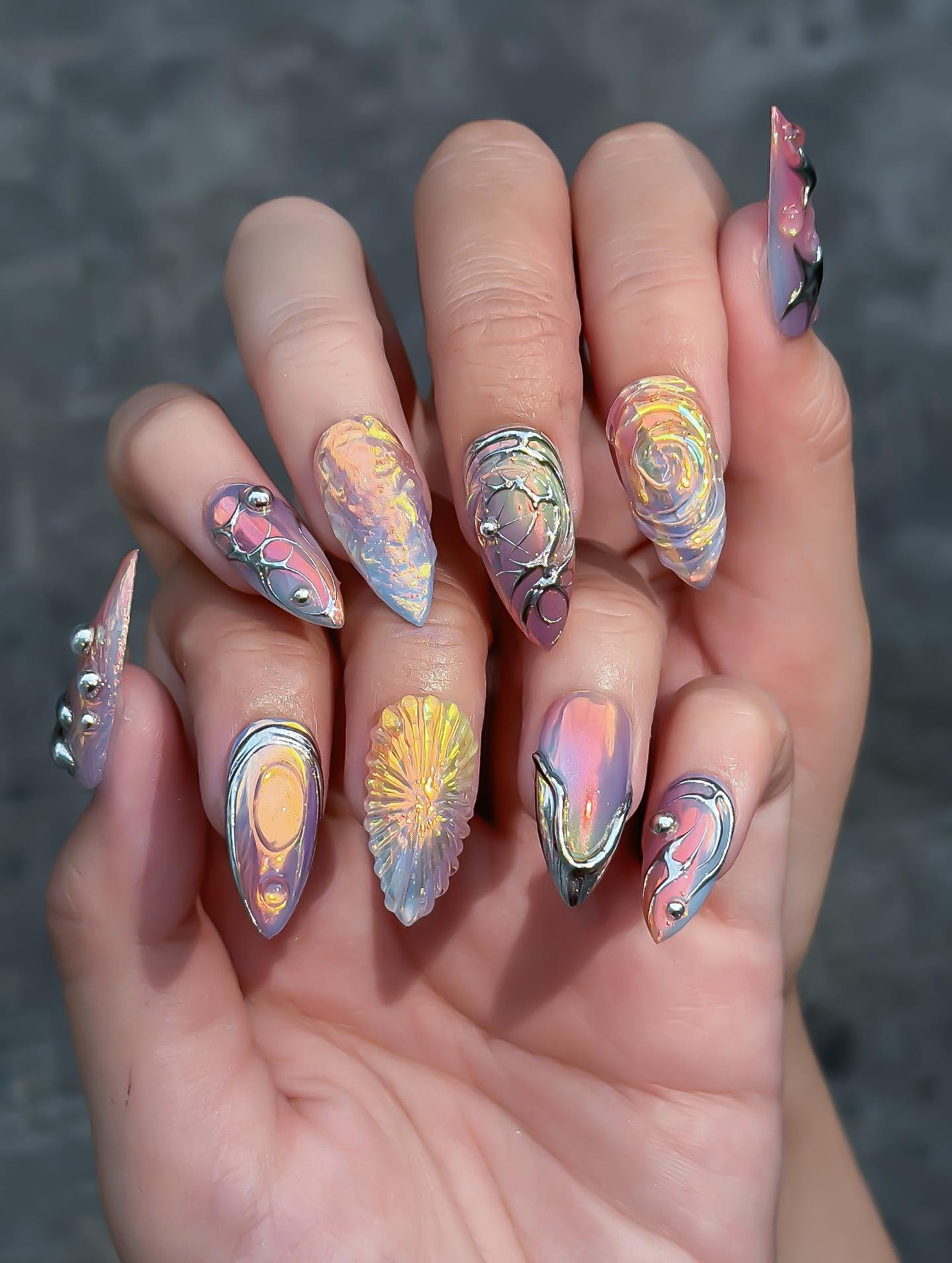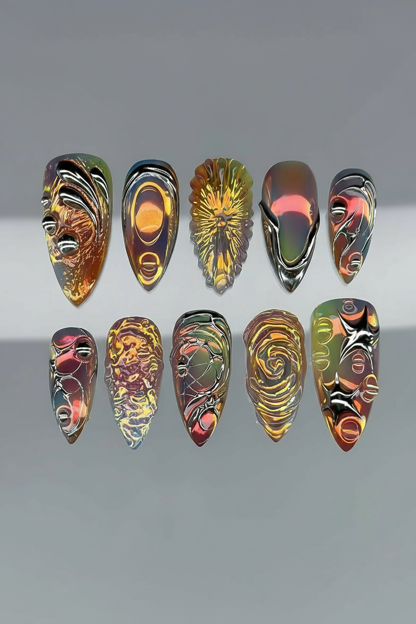 This captivating short press-on set features a rich palette of molten amber, sunset orange, and iridescent obsidian tones that glow with a fiery depth. The design is defined by intricate, hand-painted 3D textures that mimic swirling solar flares and abstract, organic ripples for a truly hypnotic finish. Striking metallic silver accents and bold sculptural elements are integrated into the surface to create a visionary, multi-dimensional silhouette. The overall aesthetic masterfully fuses Dark Surrealism with a high-fashion Cyber-Punk intensity, transforming each fingertip into a wearable work of art. These durable finishes and bold textures make the set perfect for editorial fashion, creative events, or as a powerful, avant-garde statement for your daily look.