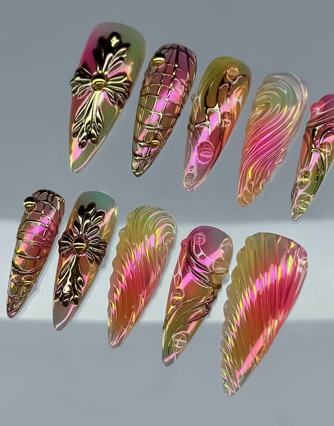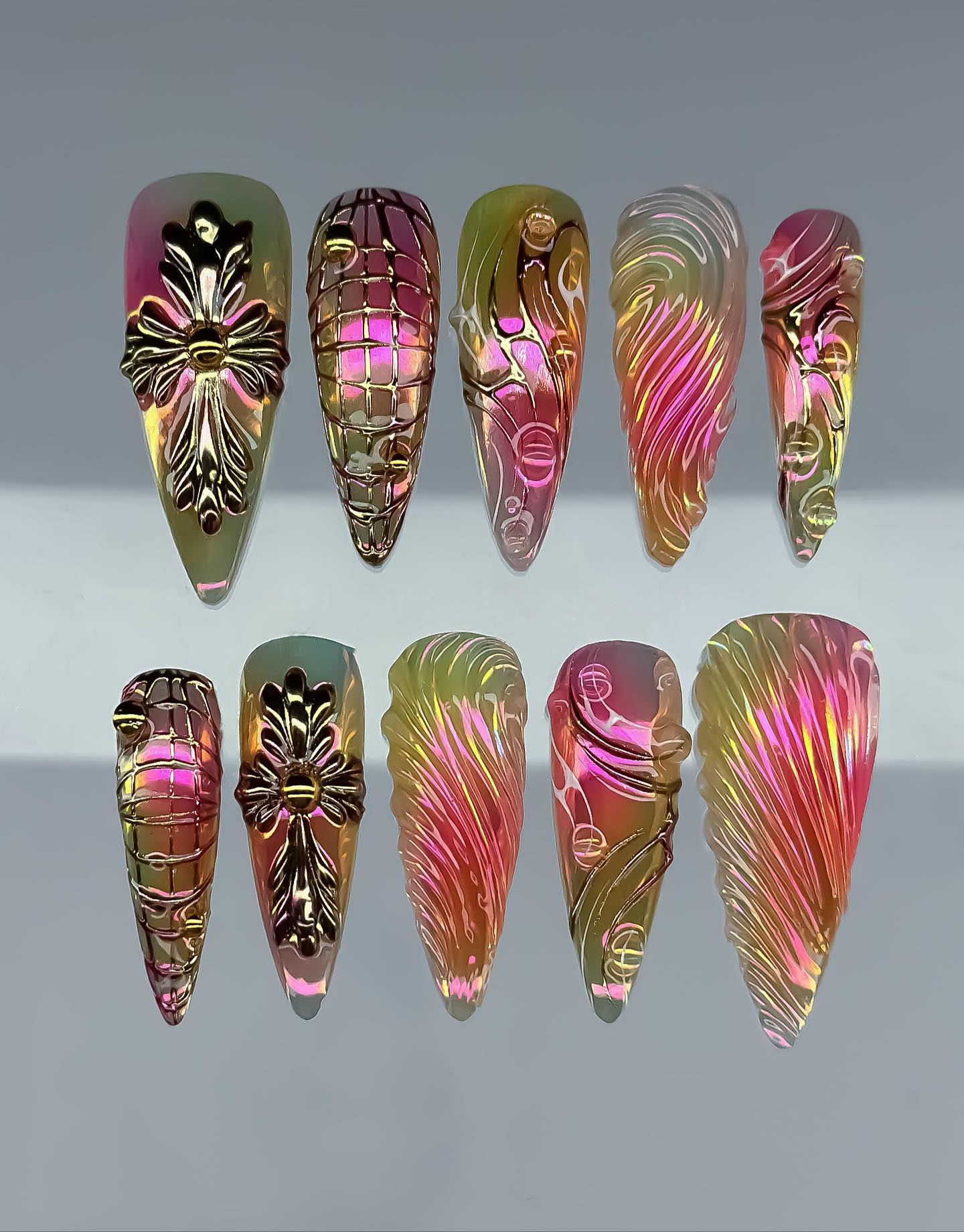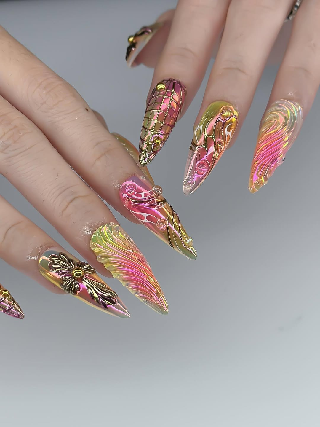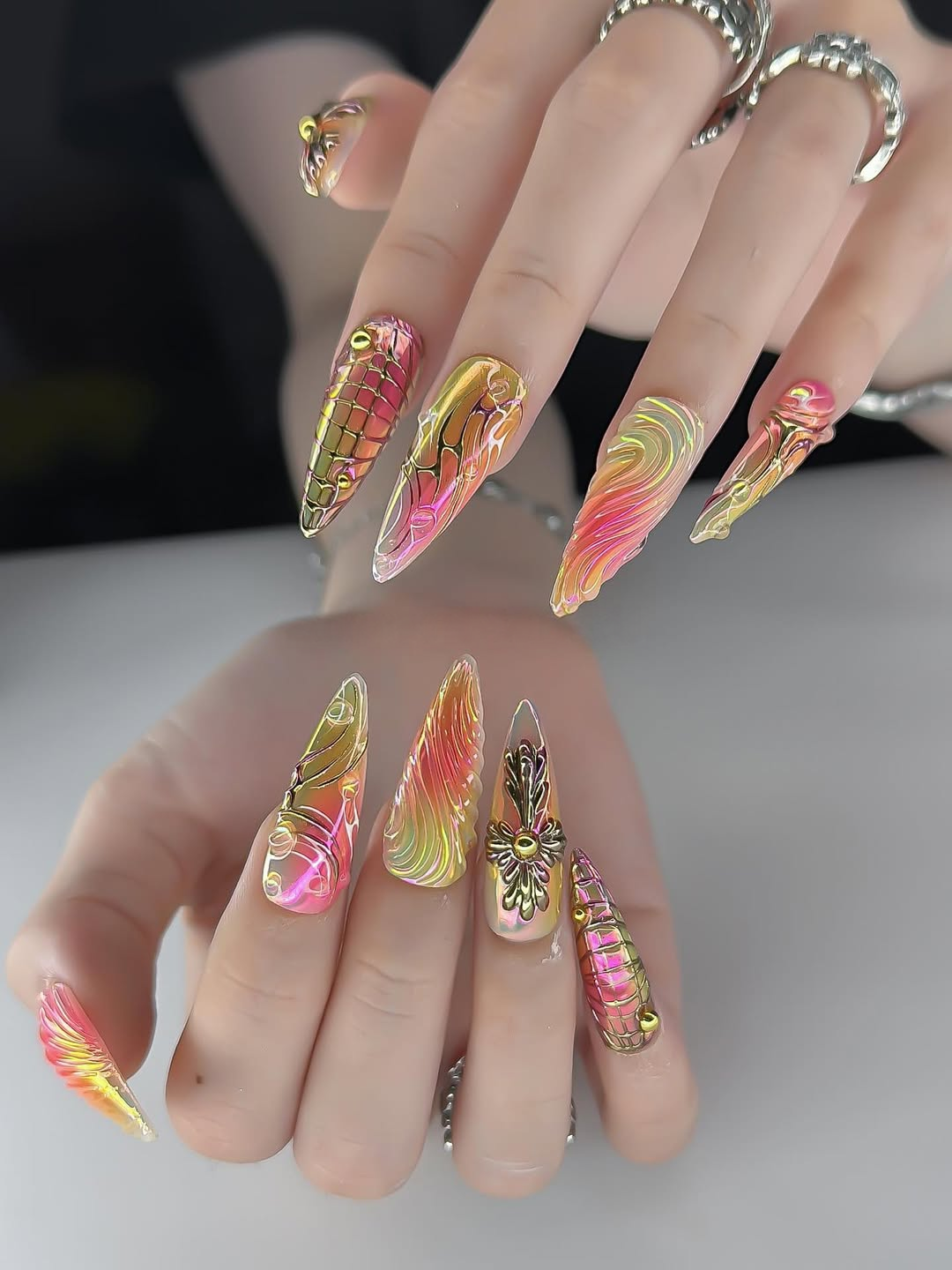 This avant-garde collection features a mesmerizing palette of iridescent sunset tones and lime-green gradients, creating a high-gloss, multi-chromatic glow. The surface is defined by intricate 3D sculpted textures, including fluid "angel wing" ripples and hand-engraved grid patterns that shift beautifully with the light. Striking golden charms, such as bold gothic crosses and liquid-metal orbs, are meticulously integrated to add a touch of regal, industrial opulence. The overall aesthetic masterfully blends Cyber-Gothic architecture with a futuristic Ethereal flair, transforming each nail into a wearable piece of digital art. These high-relief 3D elements and chrome finishes offer a luxurious tactile experience and an undeniable visual presence. The sharp, elongated stiletto shape provides a fierce and visionary silhouette, making this set a premier accessory for high-fashion editorial shoots or avant-garde events. It is the ultimate statement piece for those seeking to project an aura of powerful, sophisticated, and deeply unconventional artistic soul.