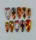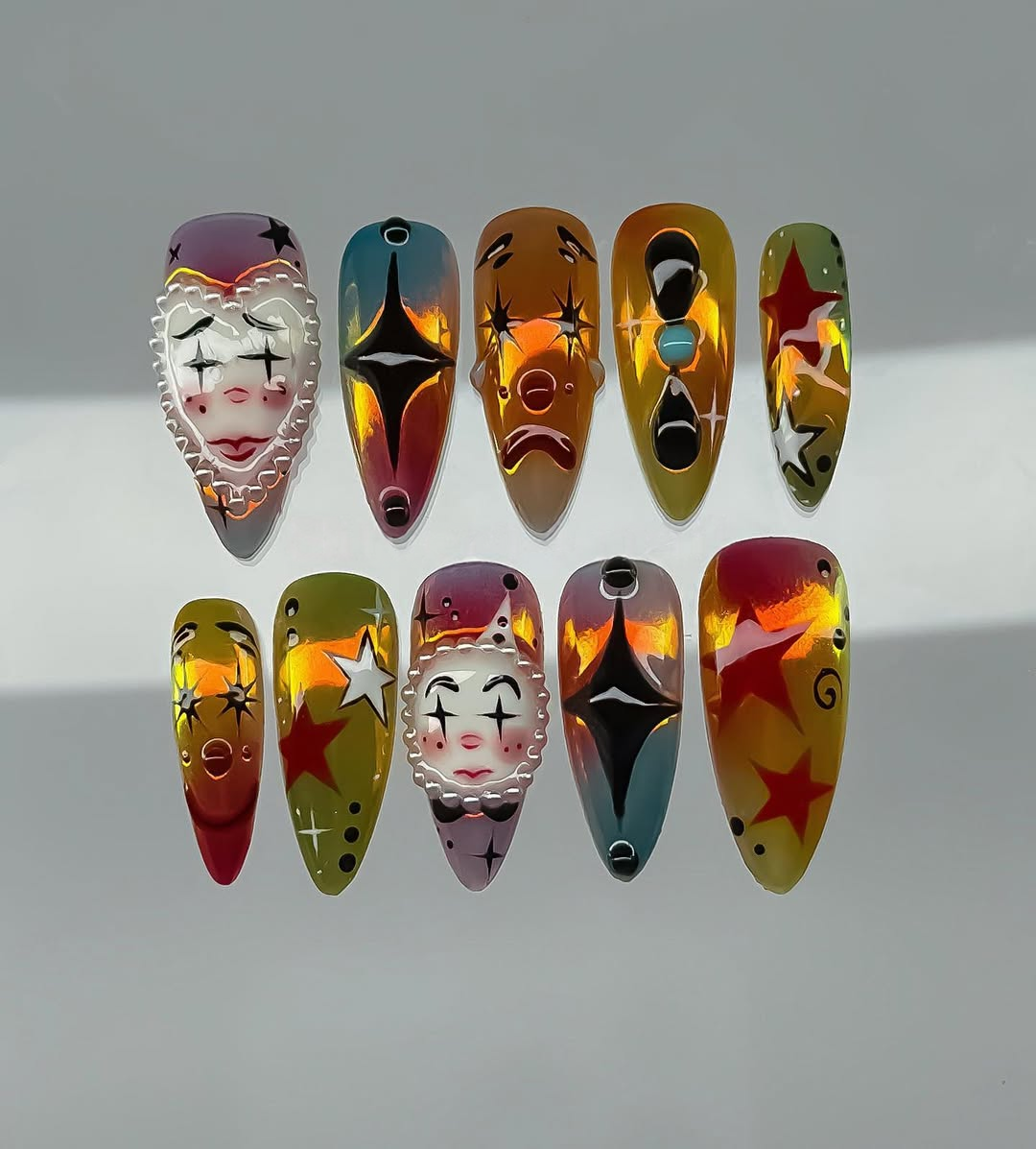 This avant-garde short press-on set features a high-octane palette of sunset orange, teal, and lime green, enhanced by a luminous iridescent glow. The artistry is defined by hand-painted harlequin-inspired clown faces, bold star motifs, and sharp geometric silhouettes that create a surreal, multi-dimensional finish. Unique sculptural elements like frilled white frames and metallic bead accents are meticulously integrated to provide a luxurious and theatrical structural depth. The overall aesthetic masterfully fuses Carnival Core whimsy with a high-fashion Cyber-Surrealism flair, transforming each fingertip into a wearable work of art. These durable finishes and vibrant details make the set perfect for creative editorial shoots, alternative fashion events, or as a bold, visionary statement for your daily style.