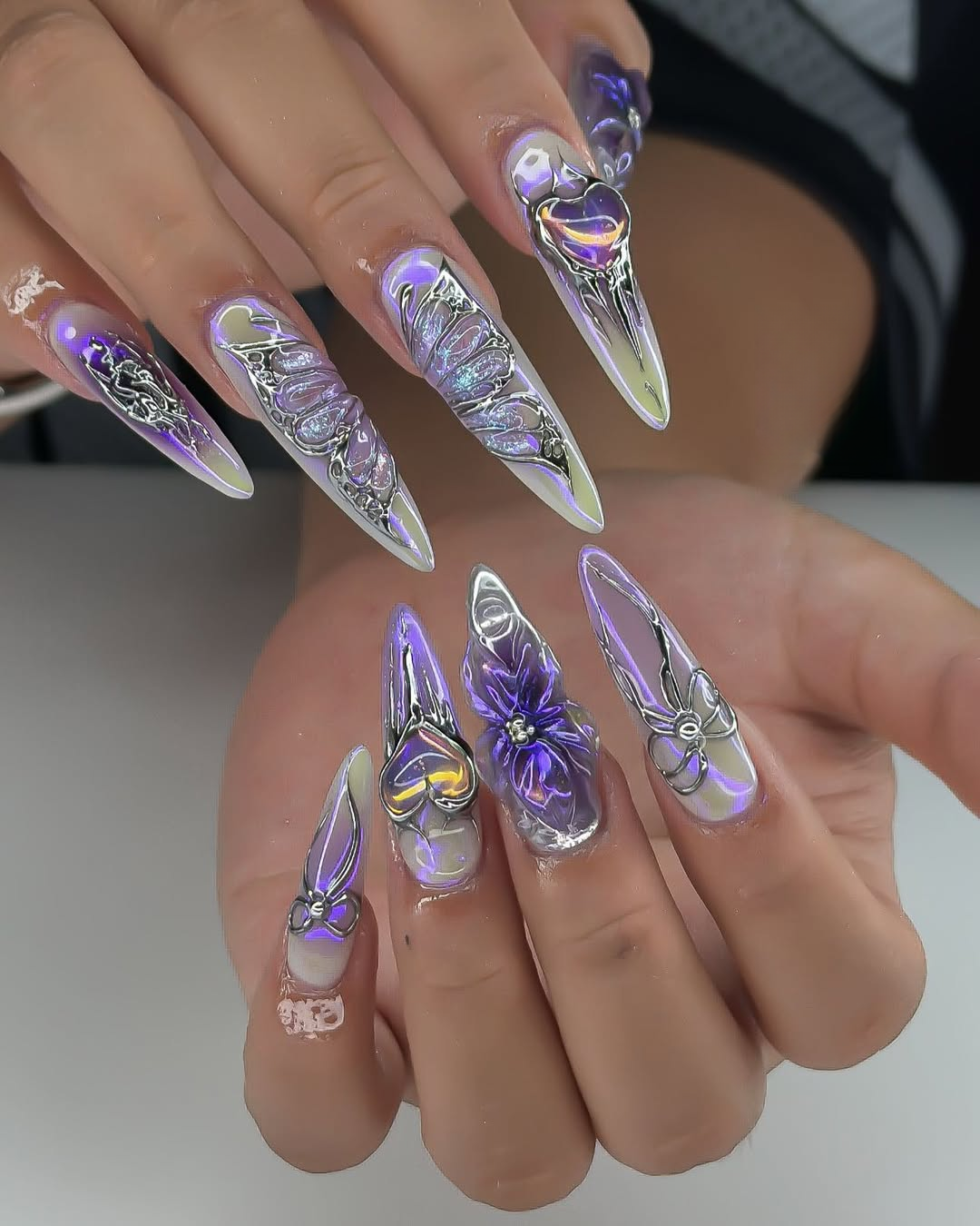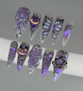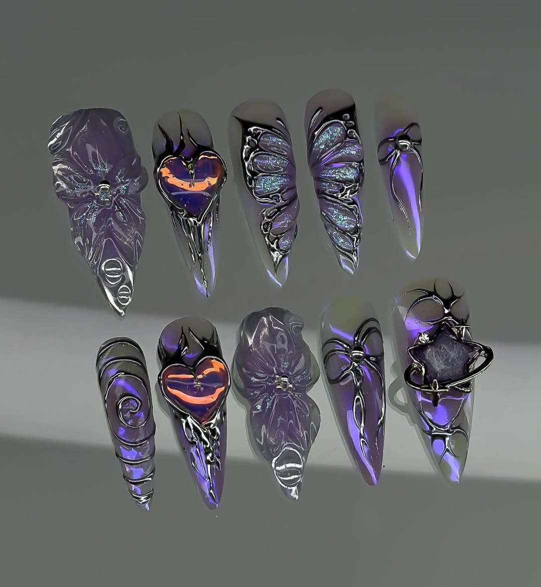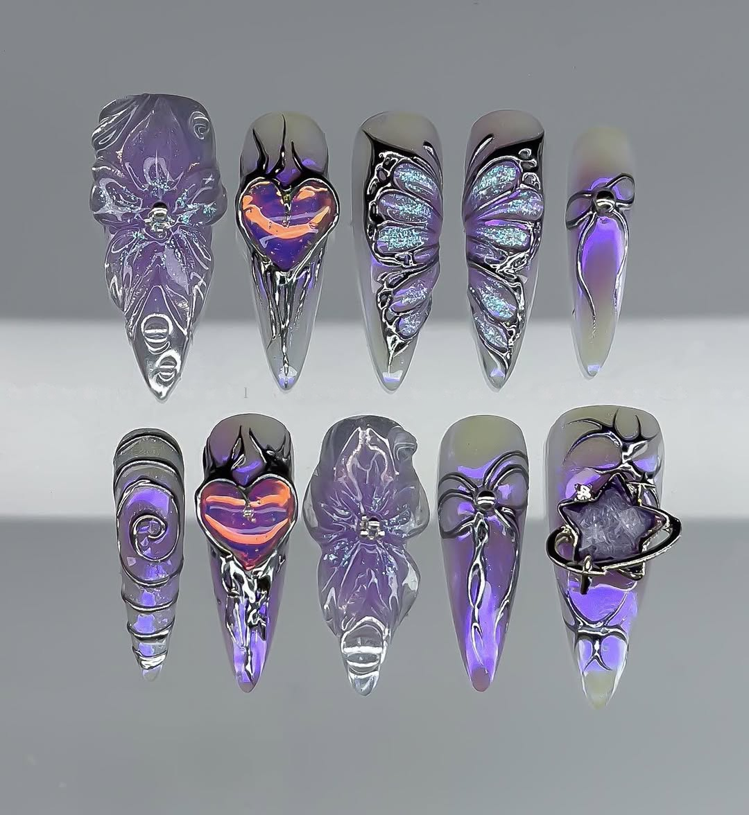 This celestial collection features a vibrant palette of deep amethyst purple and ethereal lavender, accented by iridescent holographic effects that shimmer like stardust. The design is meticulously detailed with intricate 3D-sculpted elements, including delicate butterfly wings, mystical starbursts, and romantic heart-shaped motifs. Shimmering glitter and abstract, swirling patterns enhance the set's magical, otherworldly glow. Exquisite charms, such as miniature planet rings and polished silver studs, are strategically placed to add a touch of cosmic luxury. The overall aesthetic masterfully blends Y2K Cyber-Core with a whimsical Ethereal Fantasy flair, transforming your fingertips into a wearable galaxy. These high-relief sculptural details and reflective surfaces offer a premium tactile experience, making them perfect for festivals, parties, or fashion-forward editorial shoots. It is the ultimate statement piece for those seeking to express a sophisticated, imaginative, and undeniably visionary style.