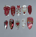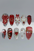 This sophisticated short press-on set features a bold palette of ruby red, stark white, and metallic silver. The design is meticulously detailed with hand-painted 3D "liquid metal" textures, intricate corset-style lacing, and radiant sunburst motifs that create a high-fashion, structural silhouette. Exquisite charms, including oversized scarlet bows, polished silver stars, and delicate gold chains, are integrated to provide a luxurious and regal depth. The overall aesthetic masterfully fuses Victorian Coquette elegance with a modern Cyber-Gothic edge, transforming each fingertip into a wearable piece of art. These durable finishes and bold sculptural elements make the set perfect for formal galas, creative photoshoots, or as a visionary everyday statement piece.
