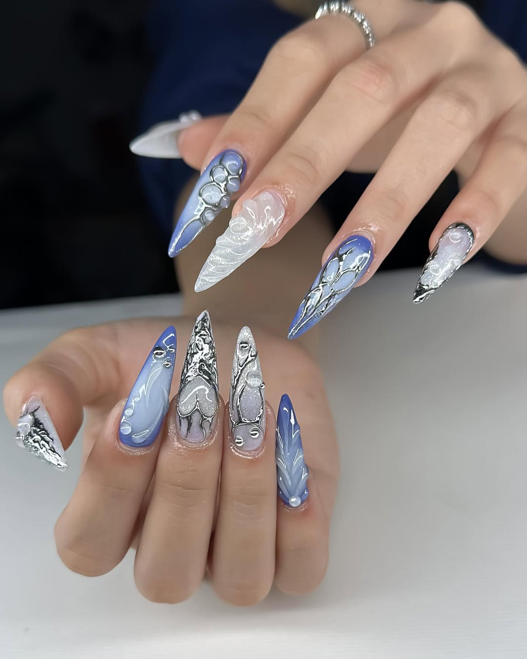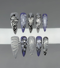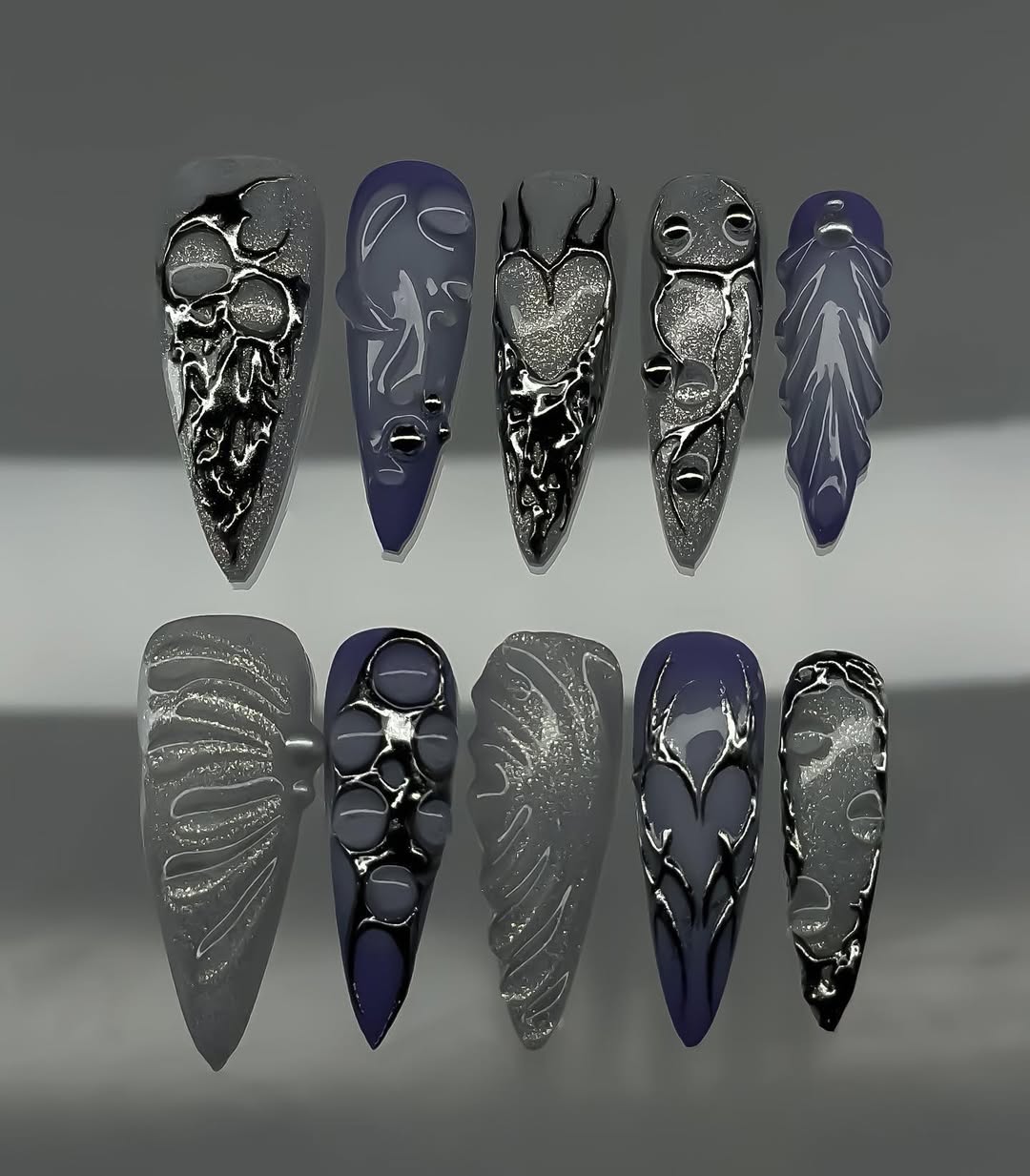 This avant-garde set features a striking palette of deep galactic purple and metallic silver, set against a shimmering grey-base finish. The design is meticulously detailed with hand-painted "liquid metal" textures and abstract, web-like patterns that evoke a sense of futuristic digital decay. Each nail showcases premium 3D sculpted elements, including fluid silver drips, heart-shaped outlines, and unique "crater" textures that provide a rich tactile experience. The overall aesthetic masterfully blends Cyber-Grunge industrialism with a high-fashion Ethereal Goth flair. These high-relief sculptural details and multi-chromatic finishes offer a visually commanding presence that transforms with every movement. The sharp, elongated stiletto shape provides a fierce and visionary silhouette, making this set a premier choice for high-fashion editorial photography or alternative events. It is the ultimate statement piece for those seeking to express a bold, imaginative, and undeniably sophisticated artistic identity.