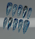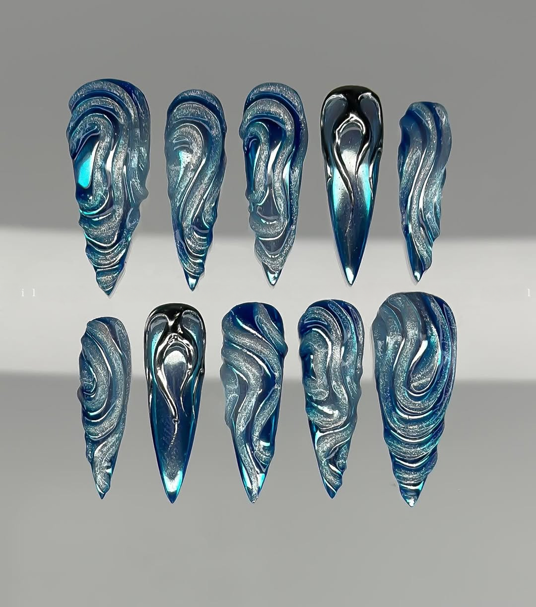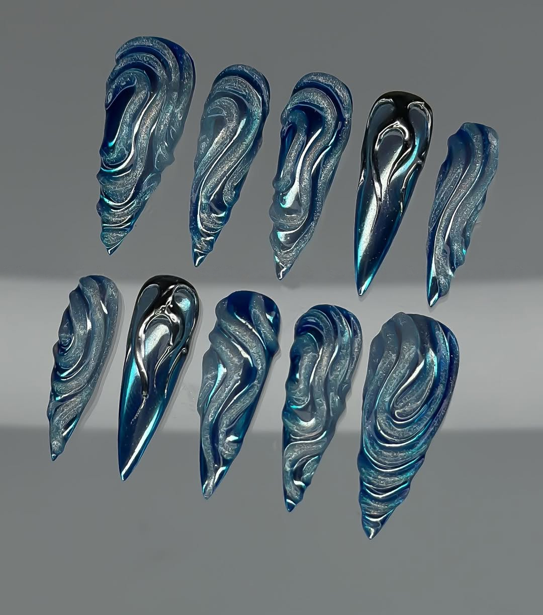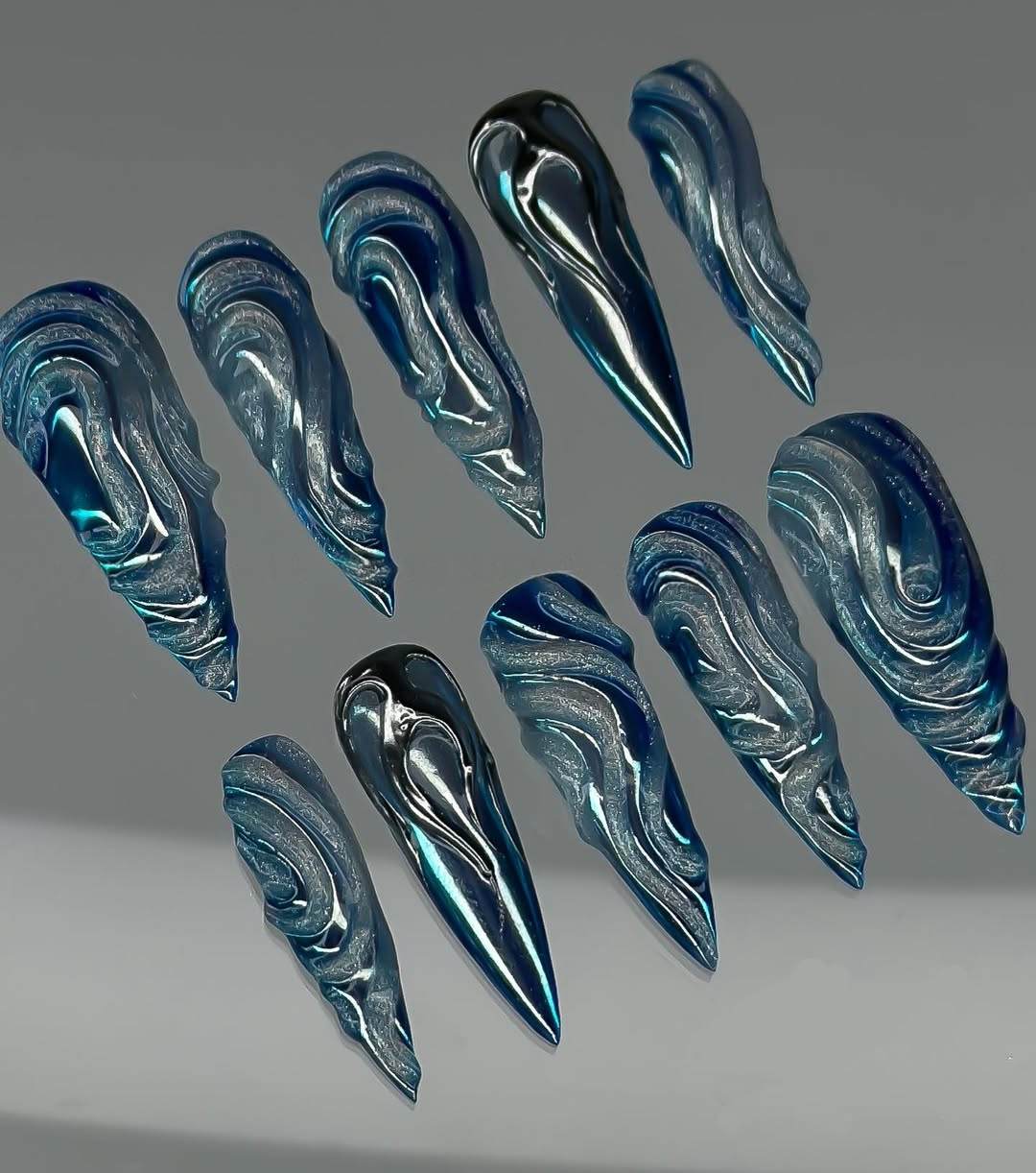 This striking press-on set features a powerful palette of deep navy blue and iridescent azure, accented by high-shine silver chrome. The design is meticulously detailed with hand-painted "liquid metal" textures and abstract swirling patterns that evoke the fluid energy of a futuristic ocean. Bold metallic charms, including polished silver crosses, radiant celestial stars, and signature industrial studs, are integrated to provide a strong structural depth. Every nail showcases a unique contrast between dark, moody gradients and sharp, luminous metallic art. The overall aesthetic masterfully blends Cyber-Punk edge with Gothic intensity, transforming each fingertip into a wearable piece of avant-garde sculpture. These high-relief sculptural details and durable finishes make the set perfect for music festivals, alternative fashion events, or editorial modeling. It is the ultimate choice for those looking to express a sophisticated, rebellious, and undeniably unique artistic identity