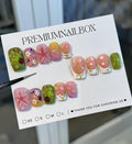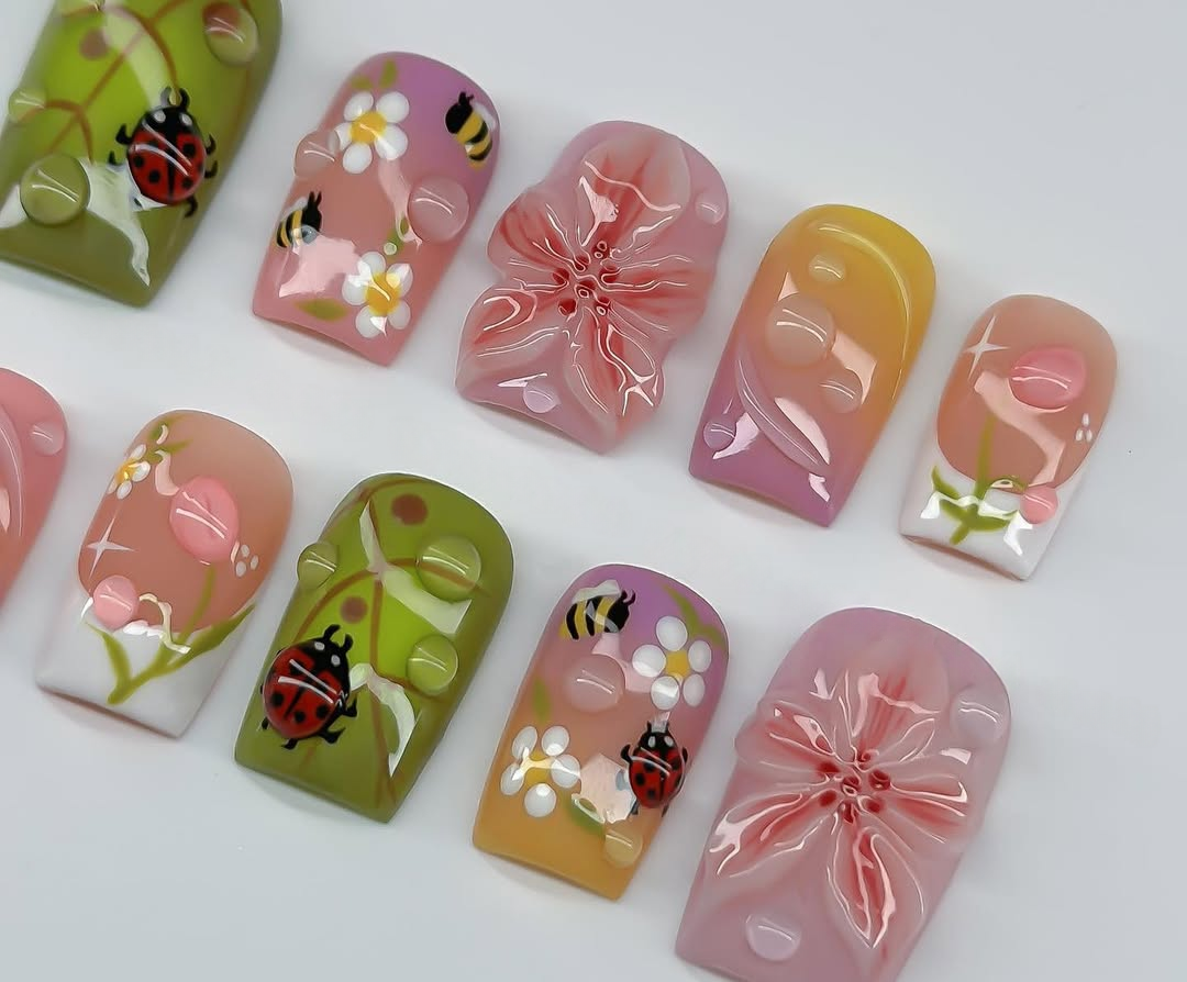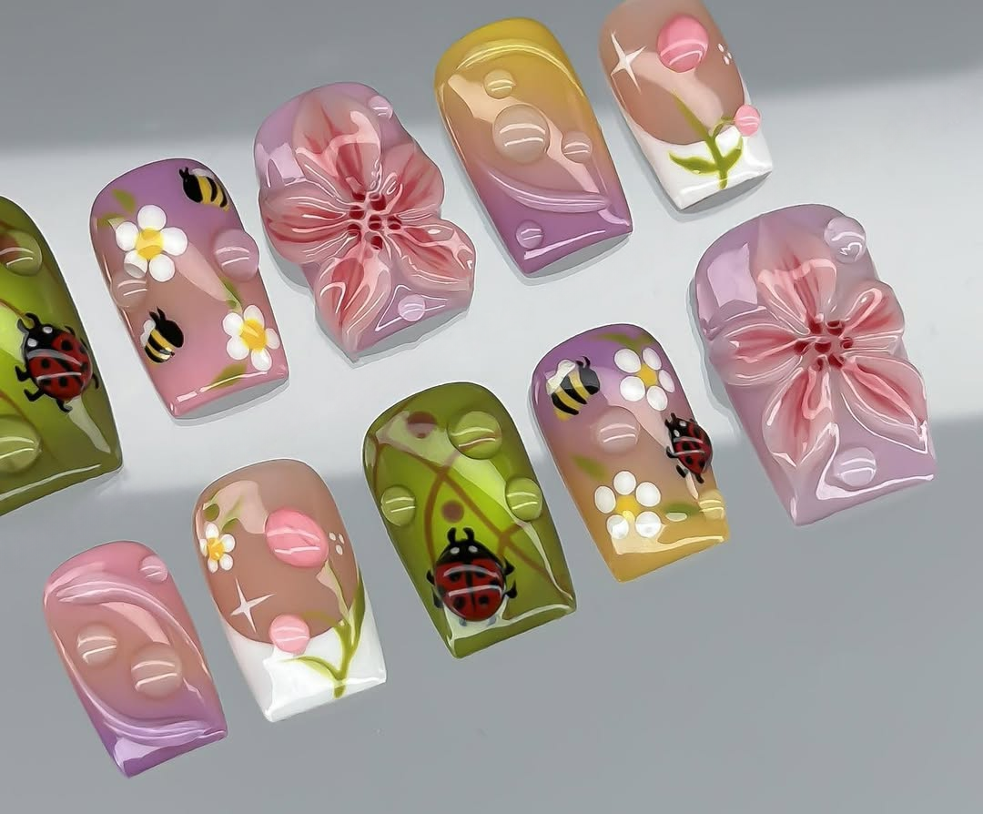 This charming short press-on set features a refreshing palette of leaf green, soft petal pink, and sunny yellow, accented by a clean white base. The design is brought to life with hand-painted illustrations of vibrant ladybugs, busy honeybees, and delicate daisies, all topped with hyper-realistic 3D "water droplets" for a fresh, morning-dew effect. A majestic 3D sculpted cherry blossom serves as the centerpiece, providing a soft and romantic structural depth to the garden theme. The overall aesthetic masterfully fuses Cottagecore sweetness with a playful Nature-Inspired flair, transforming each fingertip into a miniature vibrant meadow. These glossy, durable finishes make the set perfect for spring outings, garden parties, or adding a cheerful, artistic touch to your daily style.