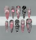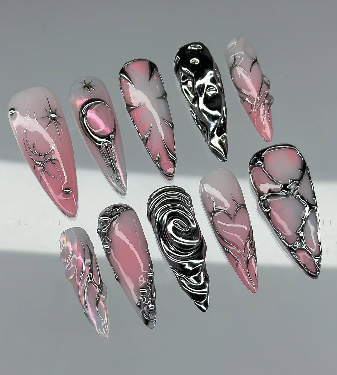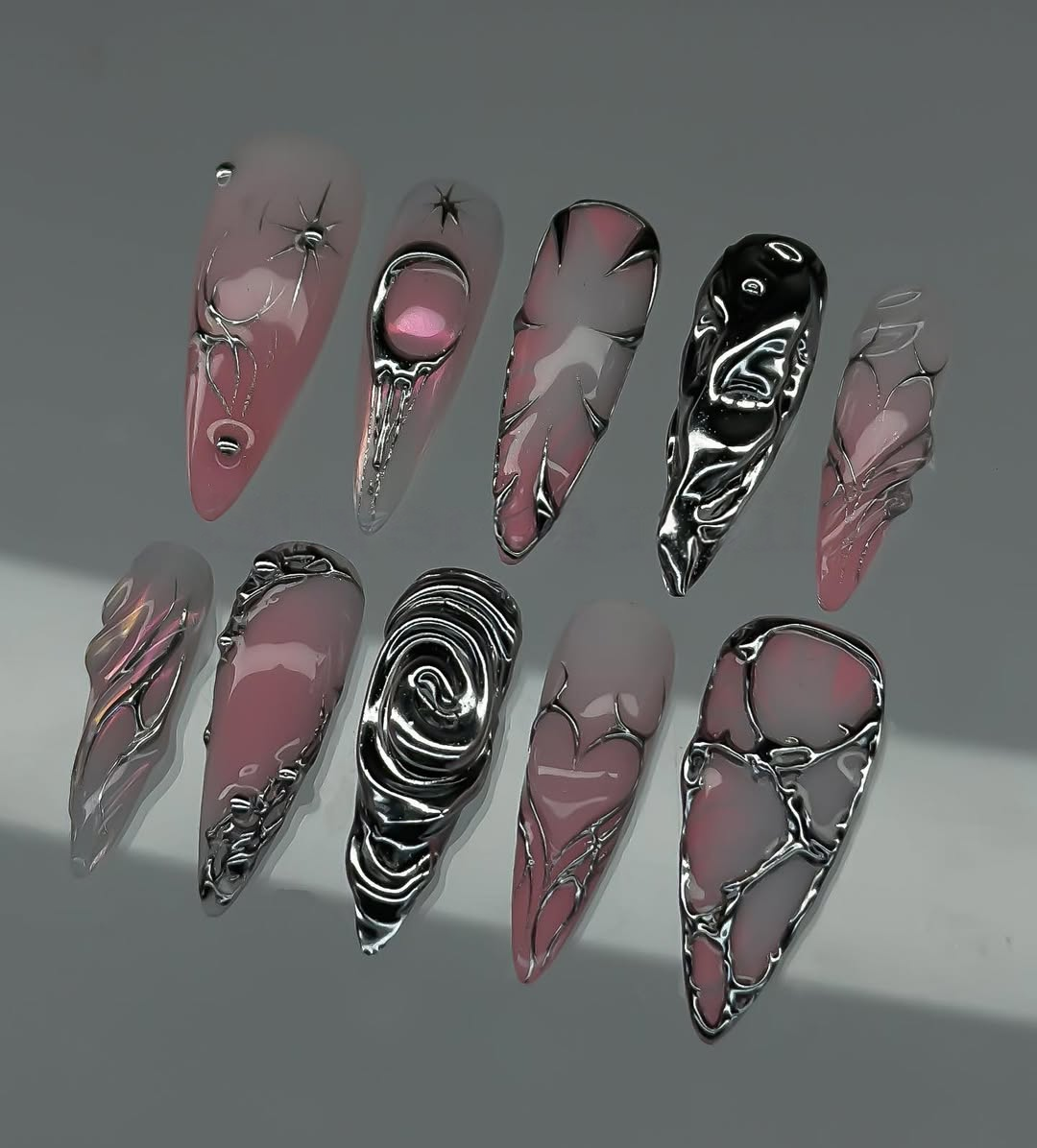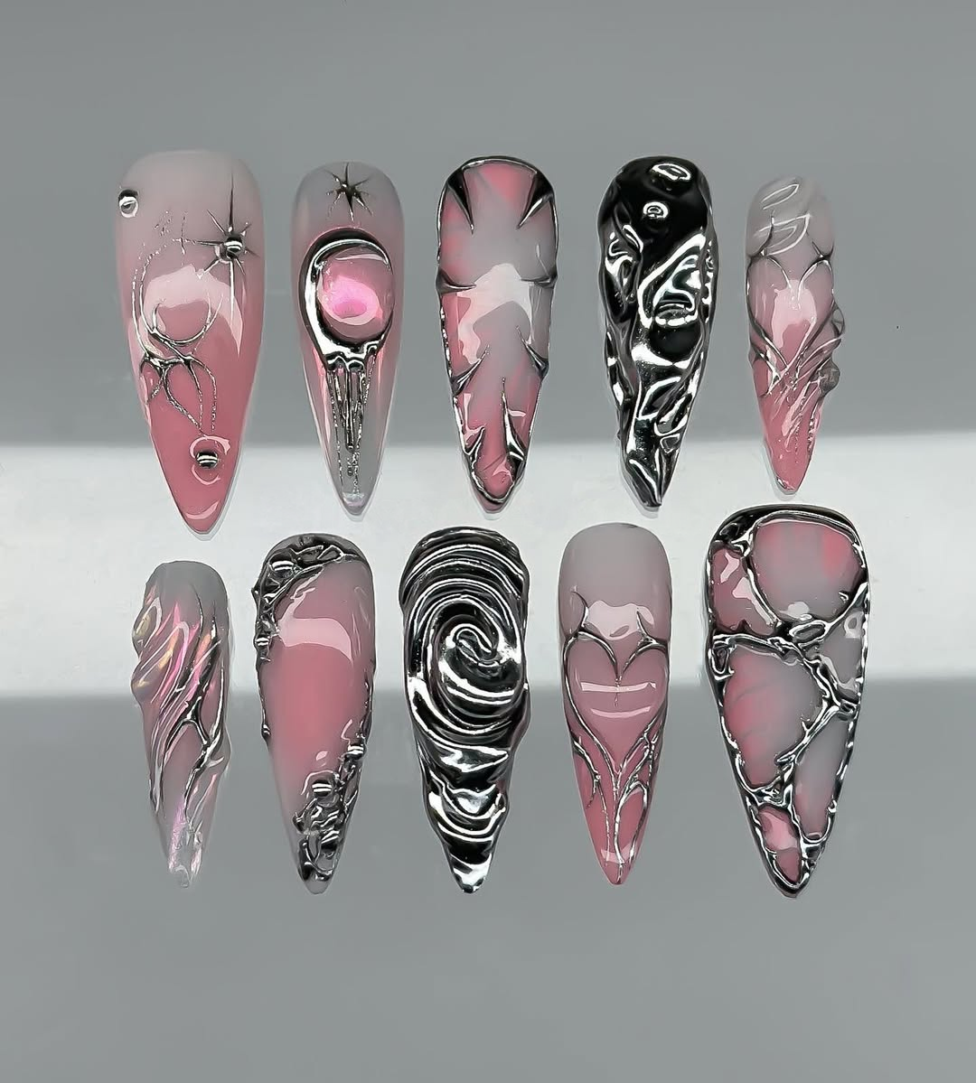 This avant-garde set features a striking palette of mirrored silver chrome and misty petal pink, set against a backdrop of translucent porcelain. The design is meticulously detailed with hand-painted "liquid metal" textures and abstract, web-like patterns that surround delicate heart-shaped outlines. Striking metallic charms, including a radiant crescent moon and shimmering celestial starbursts, are integrated to provide a powerful structural depth to the romantic theme. Fluid silver ripples and high-relief sculptural drips wrap around the nails, evoking a sense of divine yet rebellious energy. The overall aesthetic masterfully blends Victorian Gothic elegance with a high-fashion Cyber-Chrome flair, transforming each fingertip into a wearable masterpiece. These polished finishes and complex 3D elements offer a luxurious tactile experience, making them perfect for formal galas or alternative editorial shoots. The sharp, elongated stiletto silhouette provides a fierce and visionary look, serving as the ultimate statement piece for those seeking a sophisticated, artistic identity.