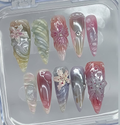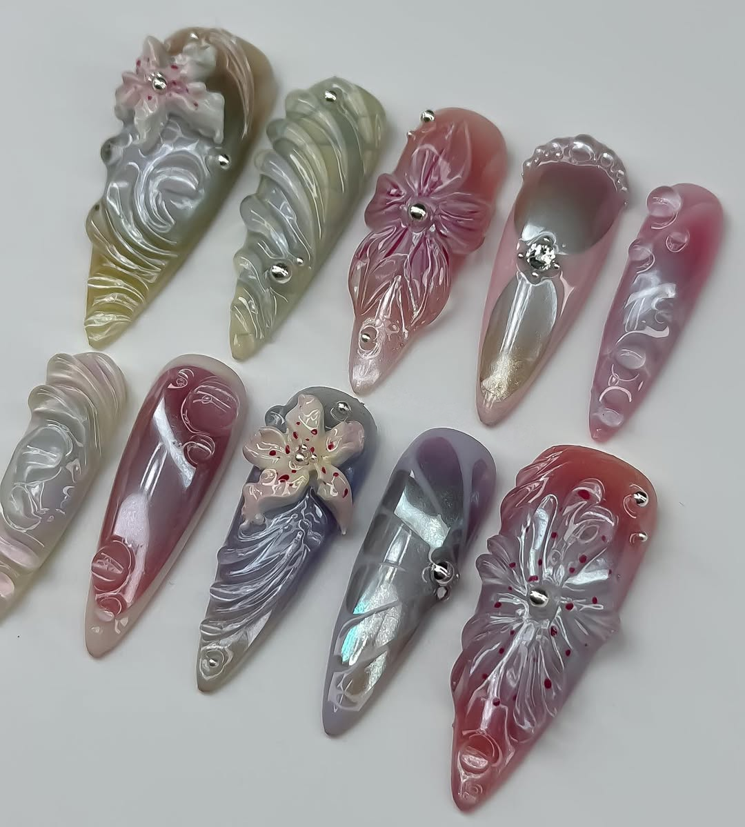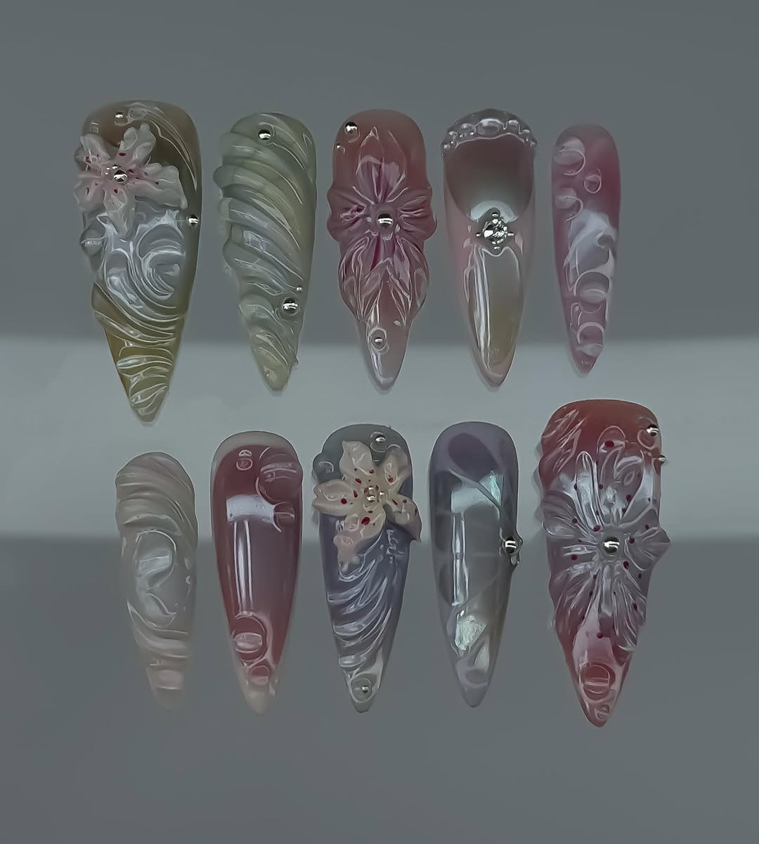 This captivating press-on set features a harmonious blend of soft sage green, misty teal, and dusty rose, all finished with a mesmerizing pearlescent glow. The design is meticulously detailed with hand-painted 3D floral blooms, including delicate lilies and roses that create a romantic, garden-inspired depth. Shimmering holographic textures and fluid, water-like ripples enhance the set's magical and otherworldly appearance. Exquisite charms, such as a polished silver heart and subtle crystal droplets, are strategically placed as refined centerpieces for the botanical motifs. The overall aesthetic masterfully fuses Vintage Coquette charm with a modern Ethereal Fantasy flair, transforming your fingertips into wearable art. These high-relief sculptural details and elegant silhouettes are perfectly suited for weddings, spring garden parties, or artistic editorial photography. It is the ultimate statement piece for those seeking to express a sophisticated, poetic, and timelessly graceful style.