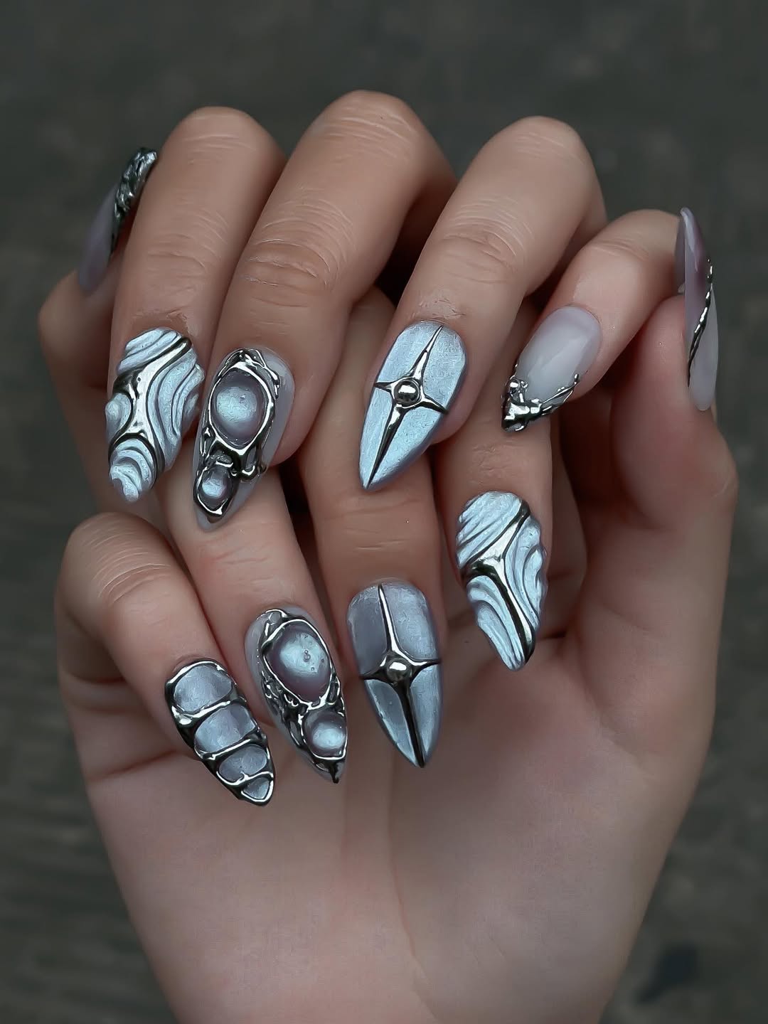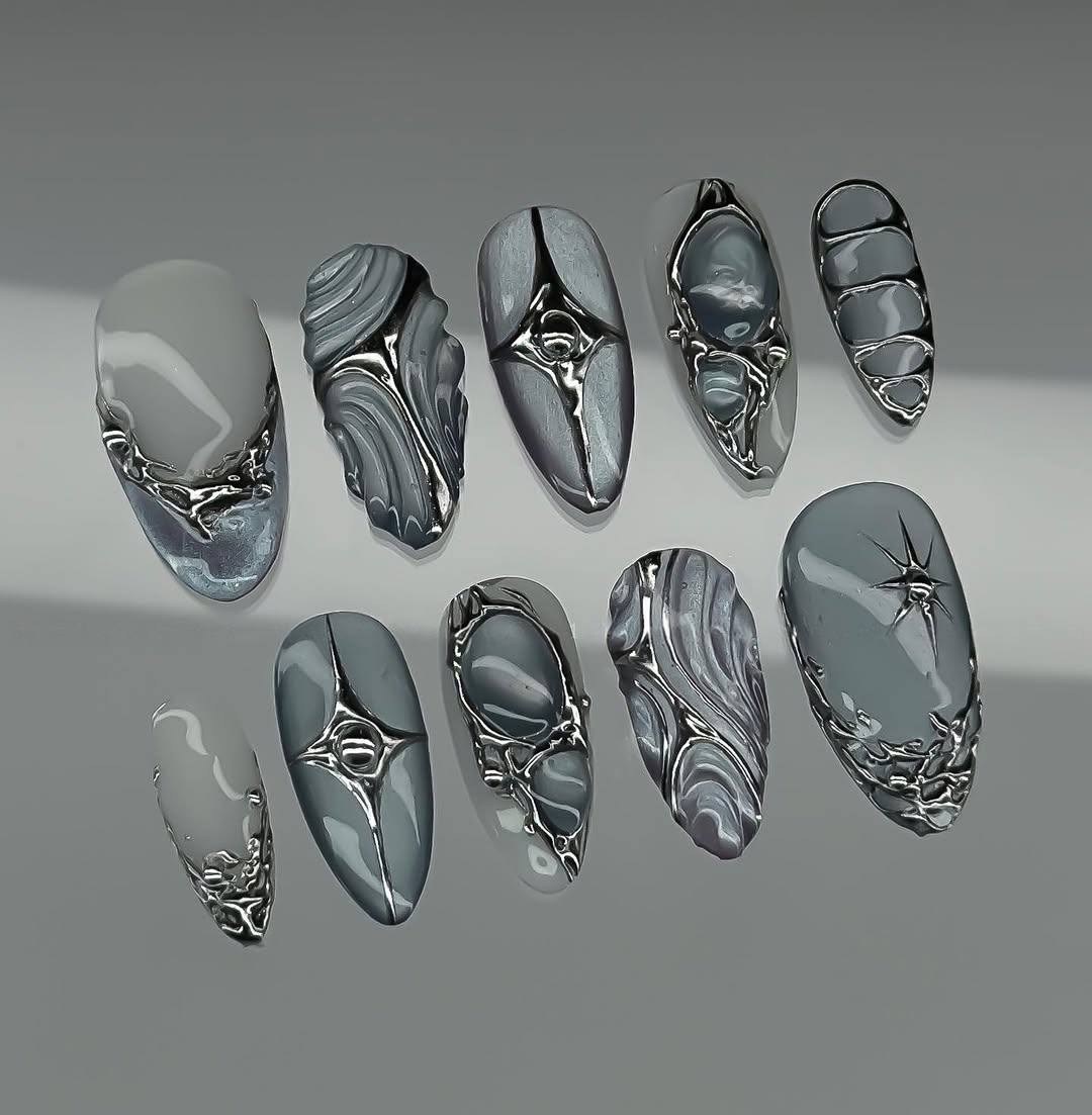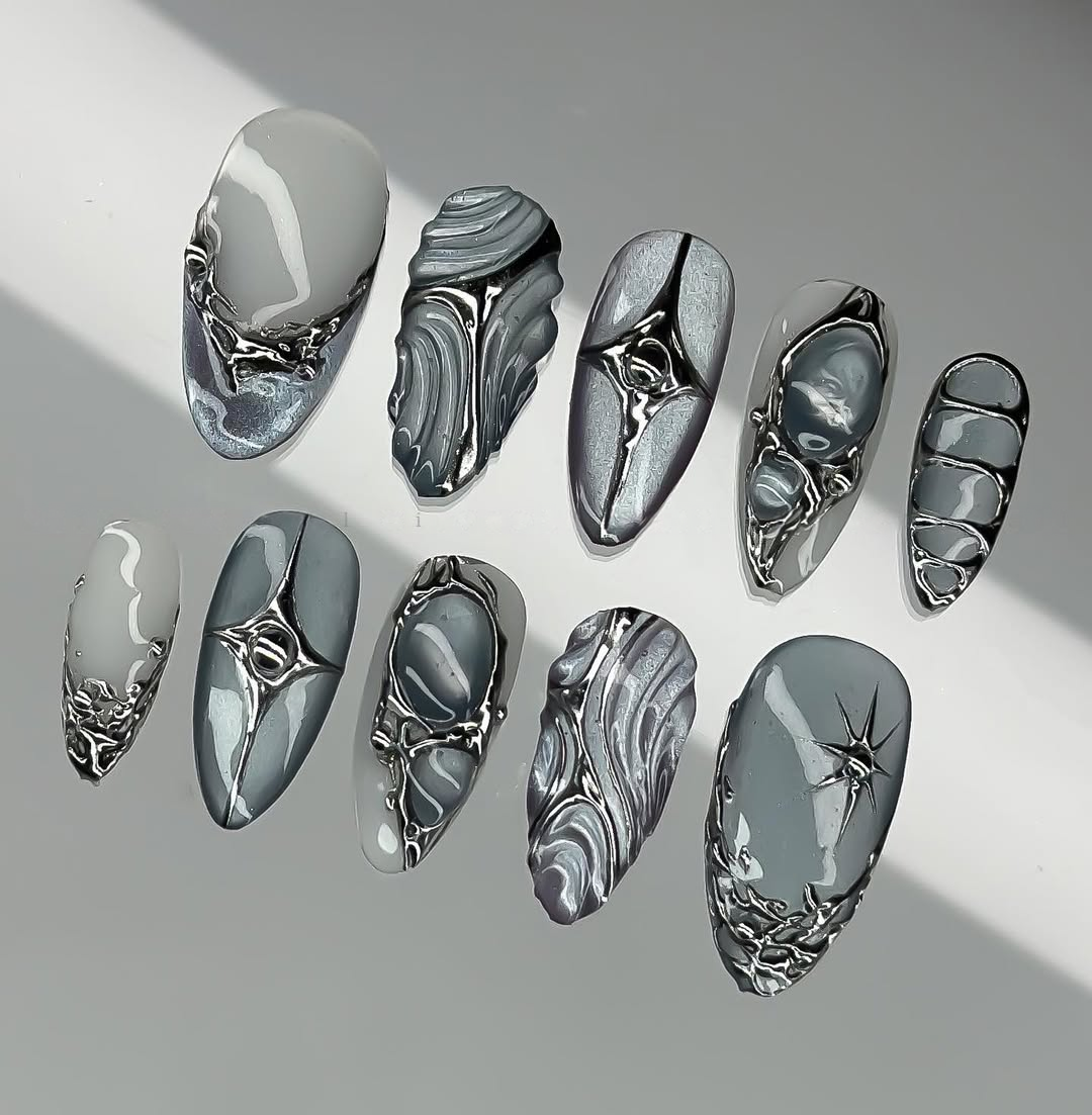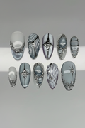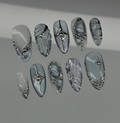 This enchanting short press-on set features a serene palette of icy blue and milky white, accented by mesmerizing iridescent shifts. The design is meticulously detailed with hand-painted 3D "liquid metal" textures, celestial star motifs, and soft, clouded gradients that create a dreamy, multi-dimensional finish. Striking silver charms, including delicate metallic bows, radiant stars, and a centerpiece heart-shaped crystal, are integrated to provide a luxurious structural depth. The overall aesthetic masterfully fuses Y2K Coquette charm with a high-fashion Cyber-Chrome edge, transforming each fingertip into a wearable piece of art. These durable finishes and polished silhouettes make the set perfect for winter events, creative photoshoots, or as a sophisticated everyday statement piece.