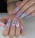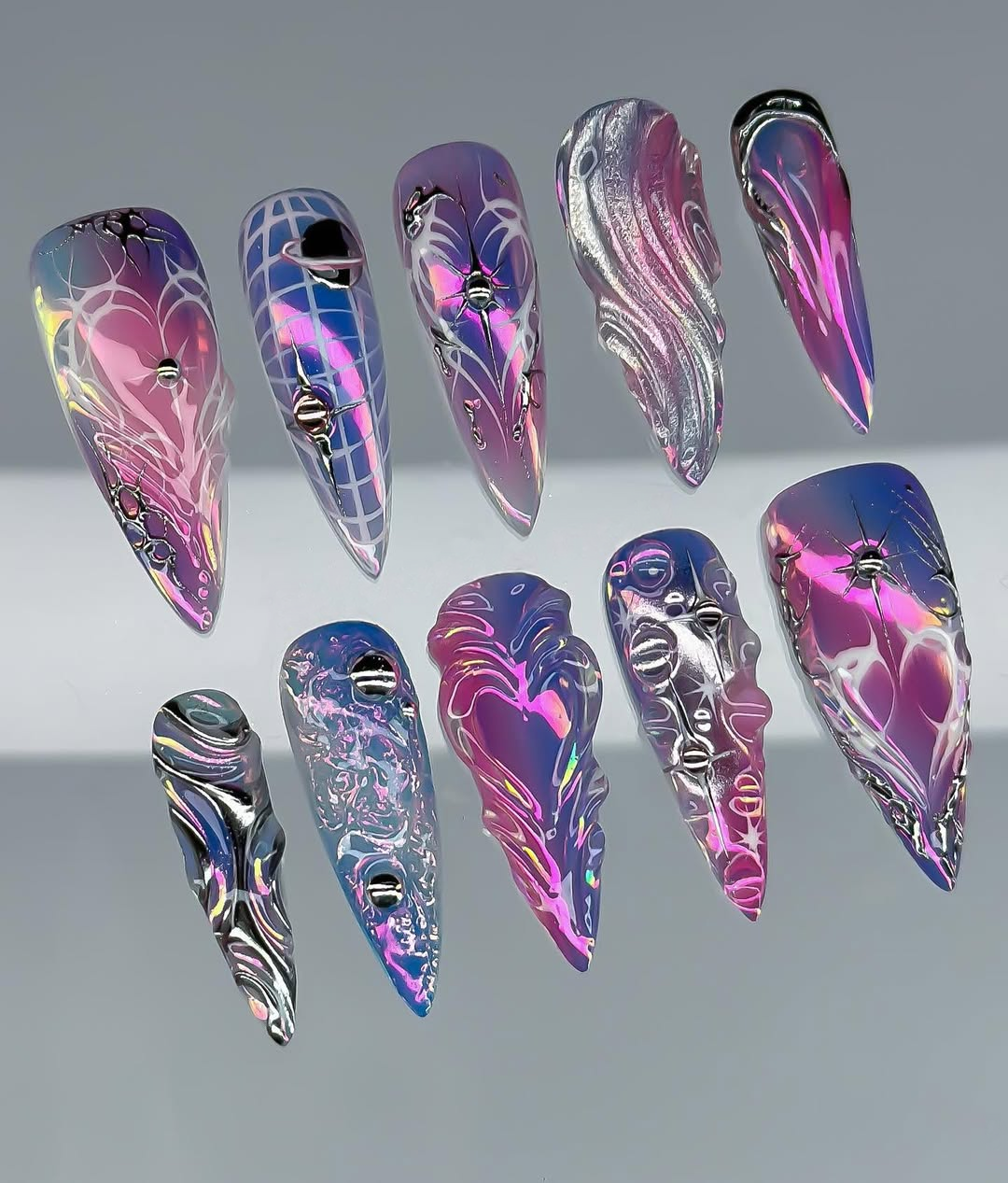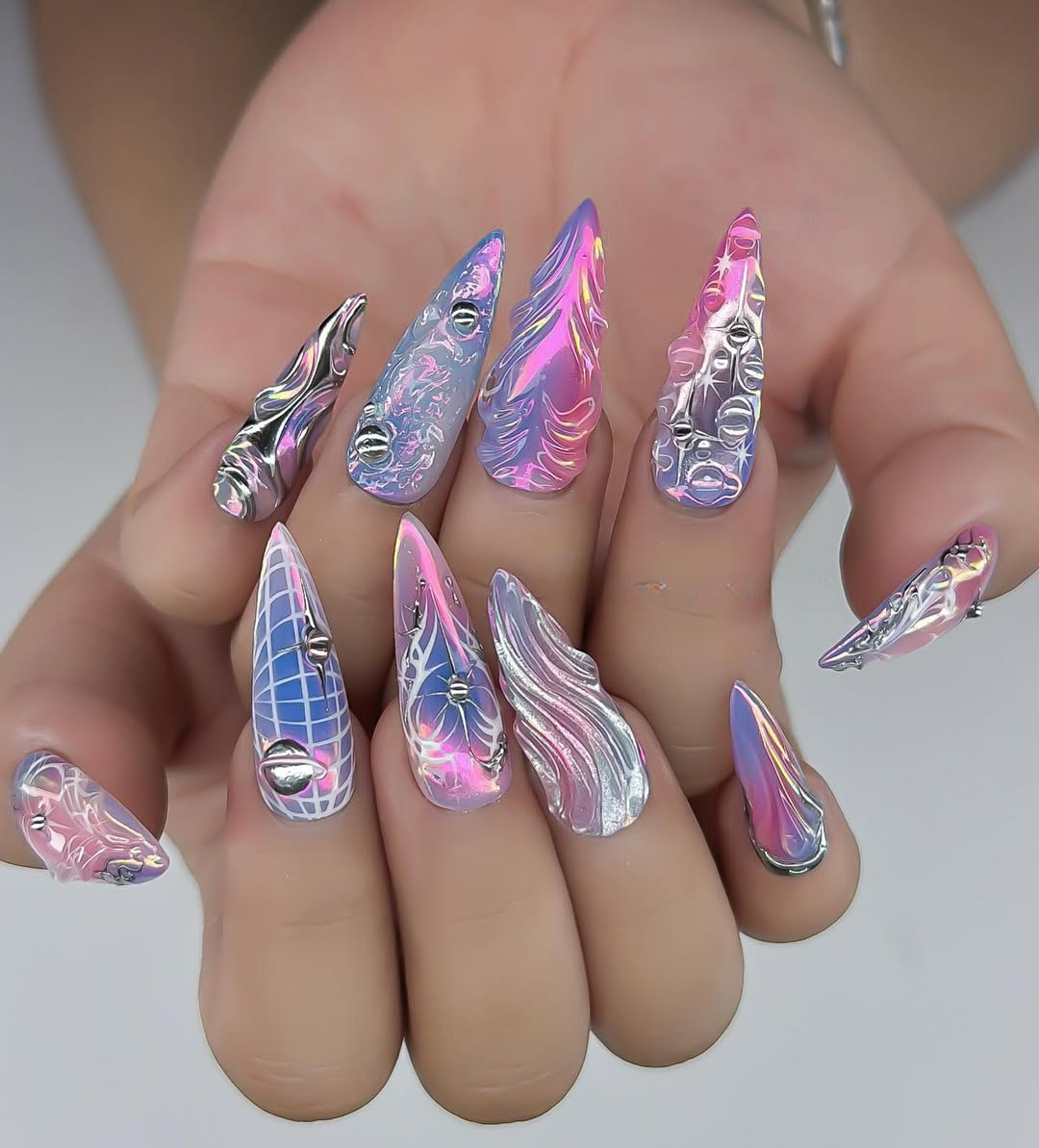 This high-fashion collection features a mesmerizing palette of holographic violet and sunset pink, shifting beautifully with every movement. The design is defined by intricate hand-painted cyber-web motifs and celestial starbursts that dance across a translucent, multi-chromatic base. Striking 3D sculpted hearts and liquid-silver chrome filigree are meticulously applied to create a bold, structural depth. The overall aesthetic masterfully blends Y2K Futurism with a sharp Cyber-Gothic edge, transforming your fingertips into wearable pieces of digital-age art. These high-relief textures and reflective finishes offer a luxurious tactile experience and a visually stunning presence under any light. The elongated stiletto shape provides a fierce and visionary silhouette, making this set a premier accessory for editorial photography or avant-garde fashion events. It is the ultimate statement piece for those seeking to express a powerful, imaginative, and deeply futuristic artistic soul.