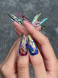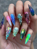 This avant-garde collection features a vibrant palette of holographic deep blue, emerald green, and sunset violet, creating a mesmerizing "oil slick" effect. The design is defined by complex 3D sculpted textures, including fluid crystalline ripples, translucent water droplets, and intricate corset-style lacing. Organic floral carvings and abstract, shell-like patterns are meticulously integrated to evoke a sense of futuristic marine life. The overall aesthetic masterfully blends Cyber-Punk energy with an Ethereal Mermaid flair, transforming each nail into a wearable piece of digital-age art. These high-relief textures and multi-chromatic finishes offer a luxurious tactile experience and a visually stunning presence that shifts with every movement. The sharp, elongated stiletto shape provides a fierce and visionary silhouette, making this set a premier choice for high-fashion editorial photography. It is the ultimate statement piece for those seeking to express a bold, imaginative, and deeply unconventional artistic soul.