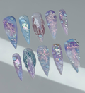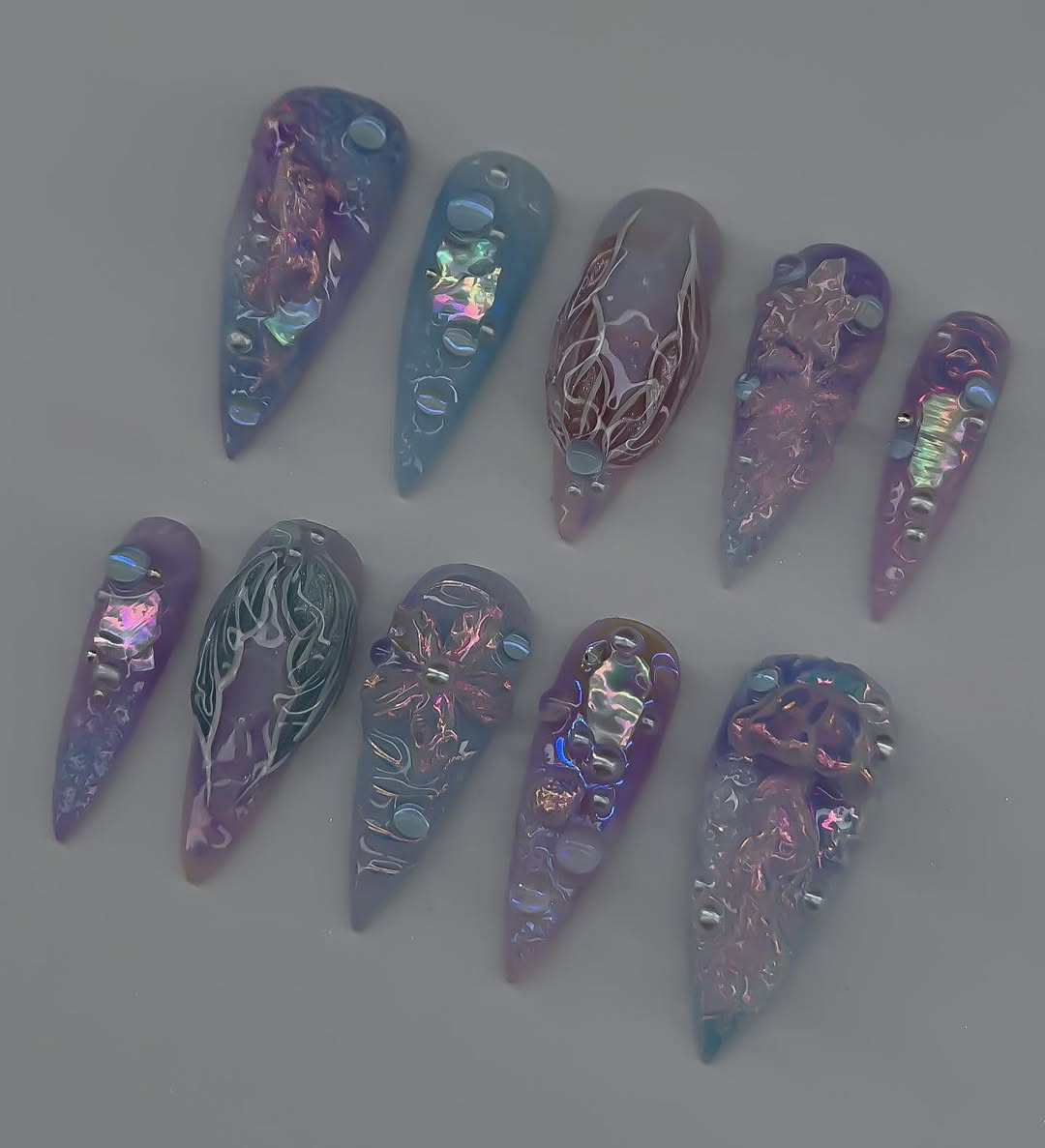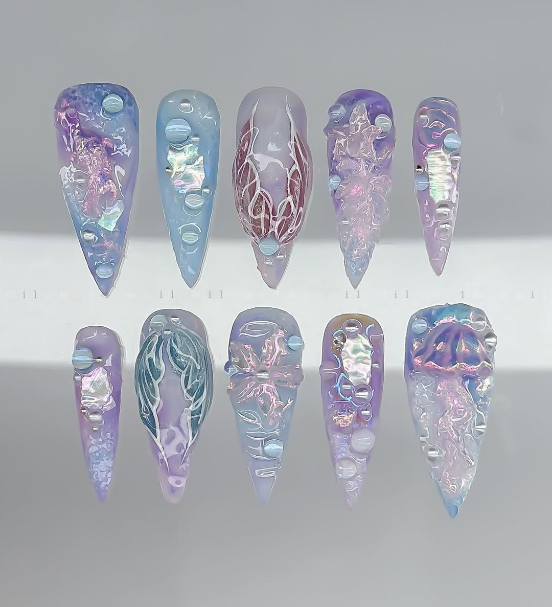 This mesmerizing collection features a fluid palette of ethereal lavender, seafoam blue, and translucent violet, creating a multi-chromatic "oil slick" effect that shifts with every movement. The design is defined by complex 3D sculpted textures, including crystalline ripples, iridescent jellyfish-like motifs, and delicate organic webs. Striking charms, such as shimmering pearlescent droplets and iridescent shell fragments, are meticulously integrated to provide a powerful, otherworldly depth. The overall aesthetic masterfully fuses Cyber-Punk energy with an Ethereal Mermaid flair, transforming each nail into a wearable piece of digital-age marine art. These high-relief textures and holographic finishes offer a luxurious tactile experience and a visually stunning presence under any light. The sharp, elongated stiletto shape provides a fierce and visionary silhouette, making this set a premier choice for high-fashion editorial photography or creative events. It is the ultimate statement piece for those seeking to project a powerful, imaginative, and deeply unconventional artistic soul.