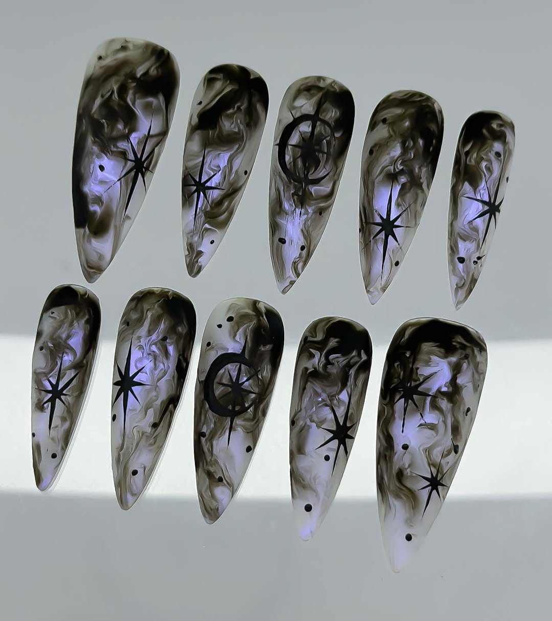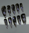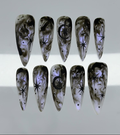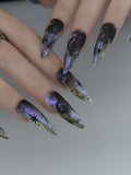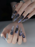 Experience the ethereal beauty of the Mystic Smoke Stars set, where hand-painted charcoal smoke swirls meet sharp, celestial starlight. This design features a hauntingly beautiful marble effect on a translucent base, accented with deep black North Stars and crescent moon motifs. The aesthetic perfectly captures a Celestial Goth vibe—mysterious, dreamy, and profoundly artistic. Each nail serves as a dark canvas of the night sky, making it an ideal choice for those who embrace their inner magic. This set is a stunning accessory for evening events, creative gatherings, or whenever you want to carry a piece of the cosmos with you.