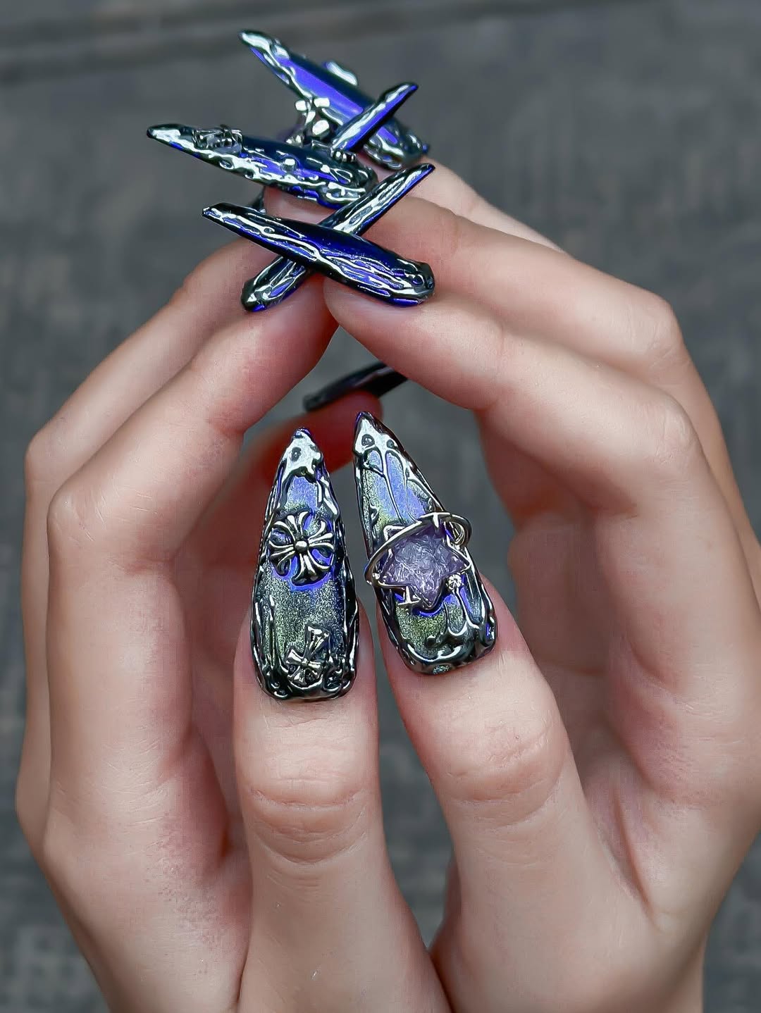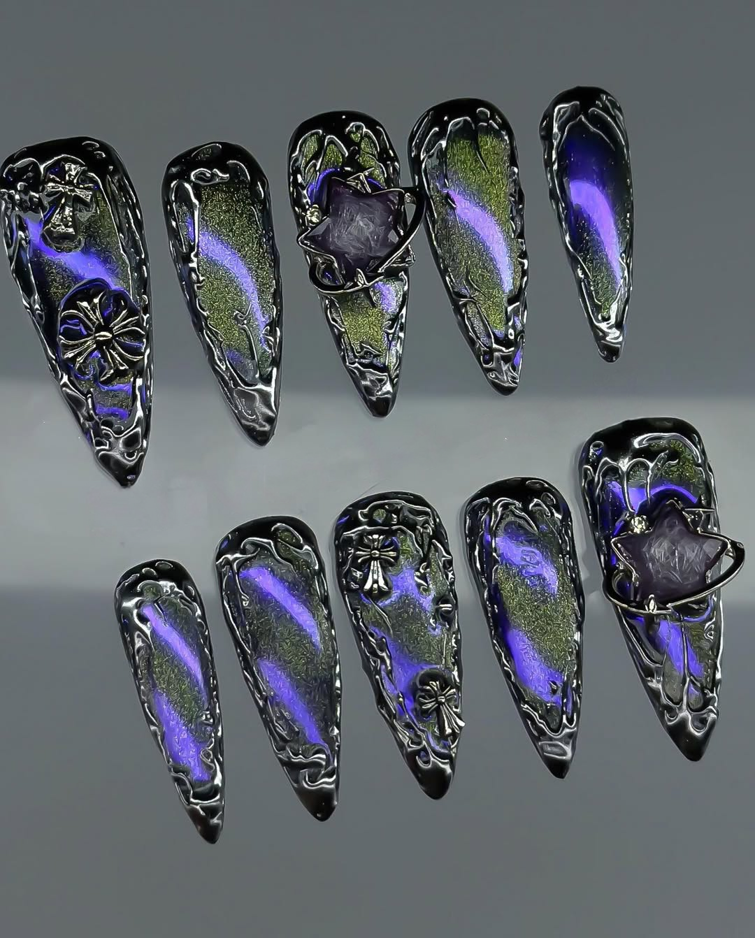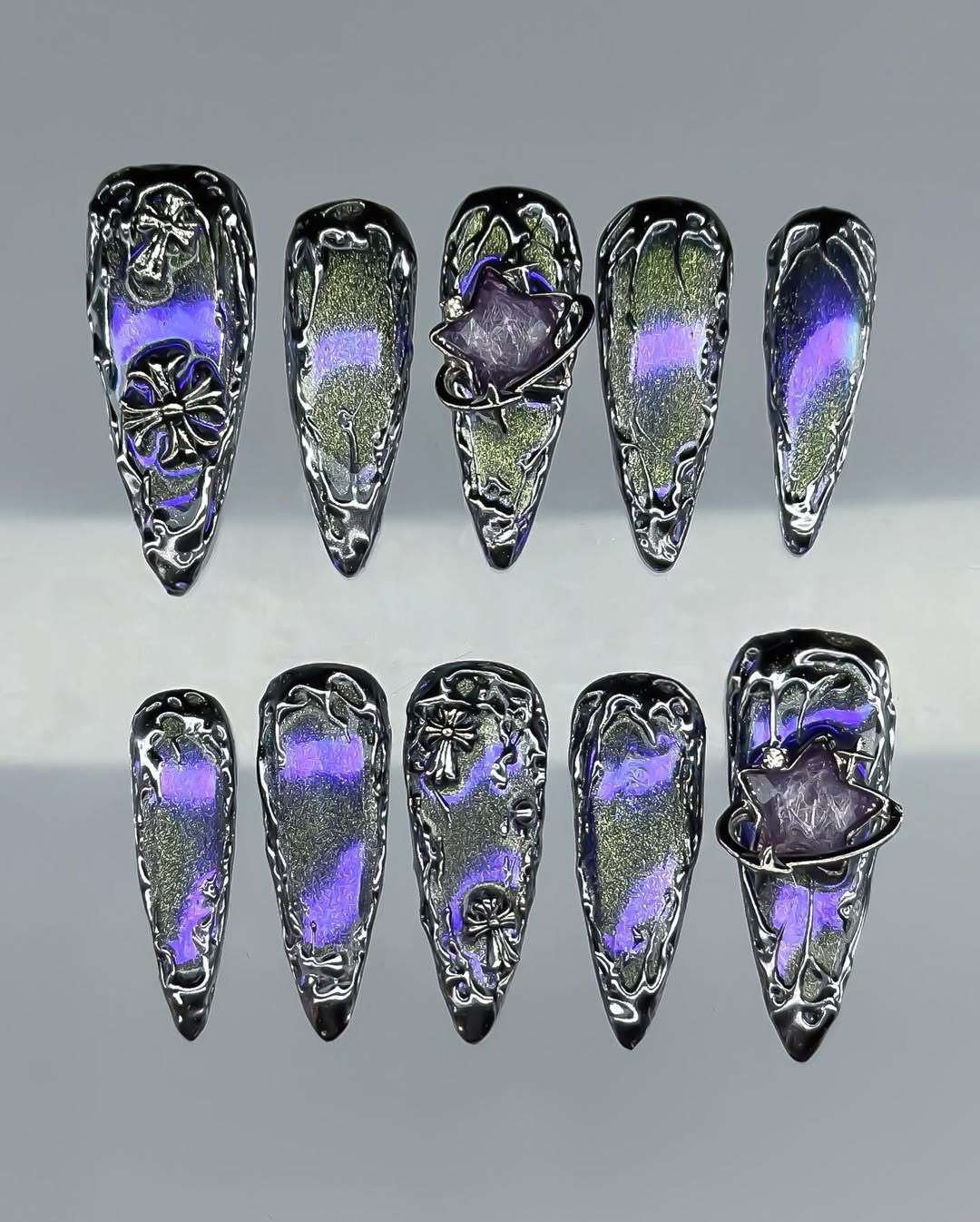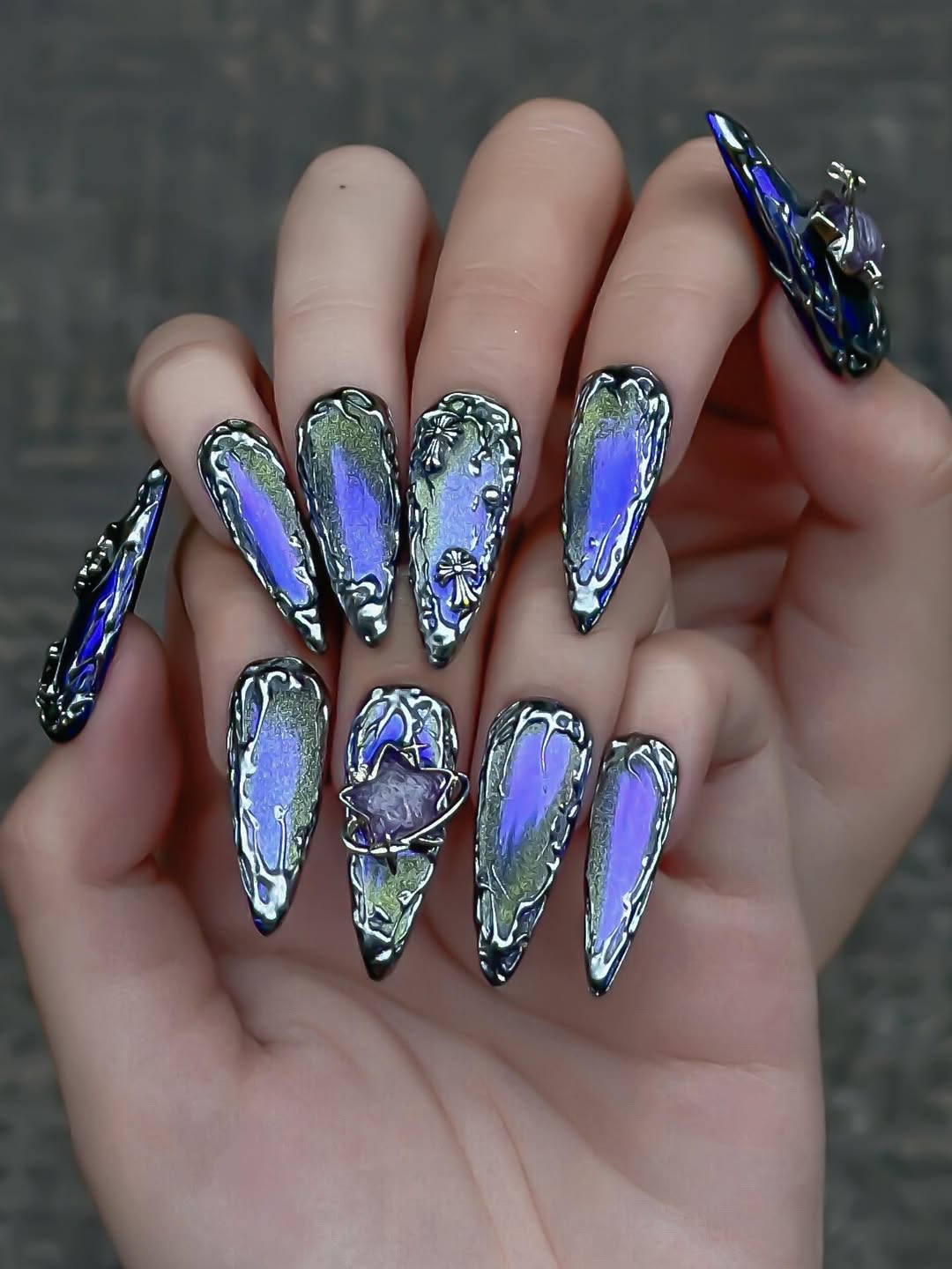 This avant-garde set features a mesmerizing palette of deep midnight purple and shimmering iridescent violet, creating a mysterious, cosmic-inspired foundation. The design is defined by complex 3D sculpted textures, including fluid "liquid-metal" silver webs and abstract, organic ripples that mimic otherworldly growth. Striking metallic charms, such as bold gothic crosses and starburst-centered planetary orbits, are meticulously integrated to add a sharp, futuristic contrast. The overall aesthetic masterfully blends Cyber-Gothic architecture with a Dark Ethereal flair, transforming each nail into a wearable piece of modern art. These high-relief textures and chrome finishes provide a luxurious tactile experience and a visually commanding presence under any light. The sharp, elongated stiletto shape provides a fierce silhouette, making this set a premier choice for high-fashion editorial photography or avant-garde fashion events. It is the ultimate statement piece for those seeking to project a powerful, imaginative, and deeply unconventional artistic soul.