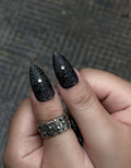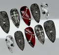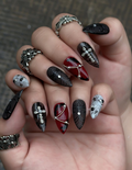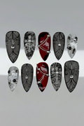 This short press-on set features a dramatic palette of matte charcoal, deep blood red, and stark white, creating a powerful visual contrast. The design is meticulously detailed with hand-painted lace textures, intricate spider web patterns, and delicate arachnid illustrations. Striking charms, including shimmering central crystals, pearl-encrusted crosses, and elegant silver chains, are integrated to provide a luxurious structural depth. The overall aesthetic masterfully fuses Victorian Gothic elegance with a dark Romantic Grunge flair, transforming each fingertip into a wearable piece of art. These high-impact visual elements and durable finishes make the set perfect for alternative fashion events, editorial shoots, or as a bold everyday statement piece.