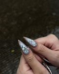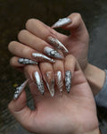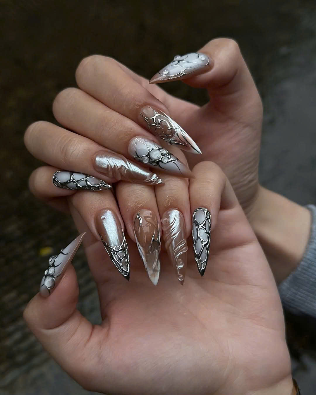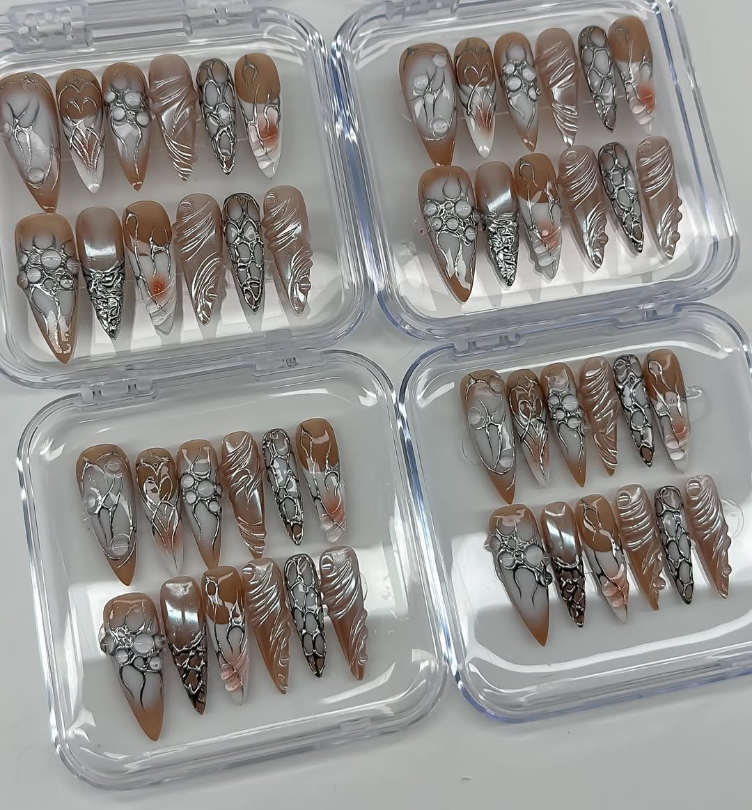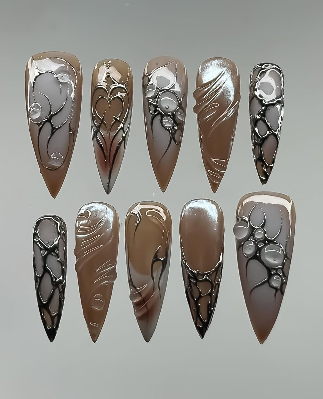 This sophisticated collection features a warm palette of mocha brown and milky tan, accented by sharp, metallic silver highlights. The design showcases intricate hand-painted silver "webbing" and organic, bubble-like 3D textures that mimic liquid metal. Some nails feature a smooth, pearlescent shimmer, while others are defined by bold, fluid line work and heart-shaped silver outlines. The overall aesthetic masterfully blends Cyber-Gothic industrialism with a contemporary Earthy Neutral edge, turning each nail into a wearable piece of futuristic art. These high-relief 3D elements and chrome finishes offer a luxurious tactile experience and a visually commanding presence. The sharp, elongated stiletto and coffin shapes provide a fierce, visionary silhouette, making this set a premier choice for high-fashion editorial shoots. It is the ultimate statement piece for those seeking a look that is both sophisticated and deeply unconventional.