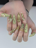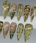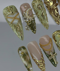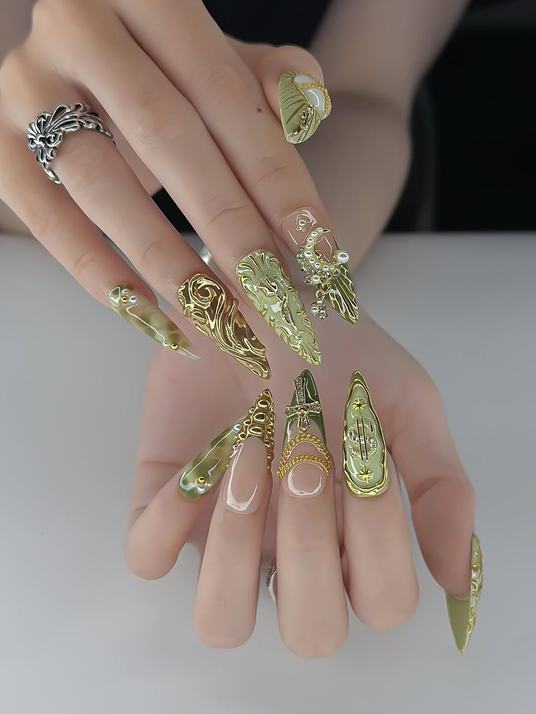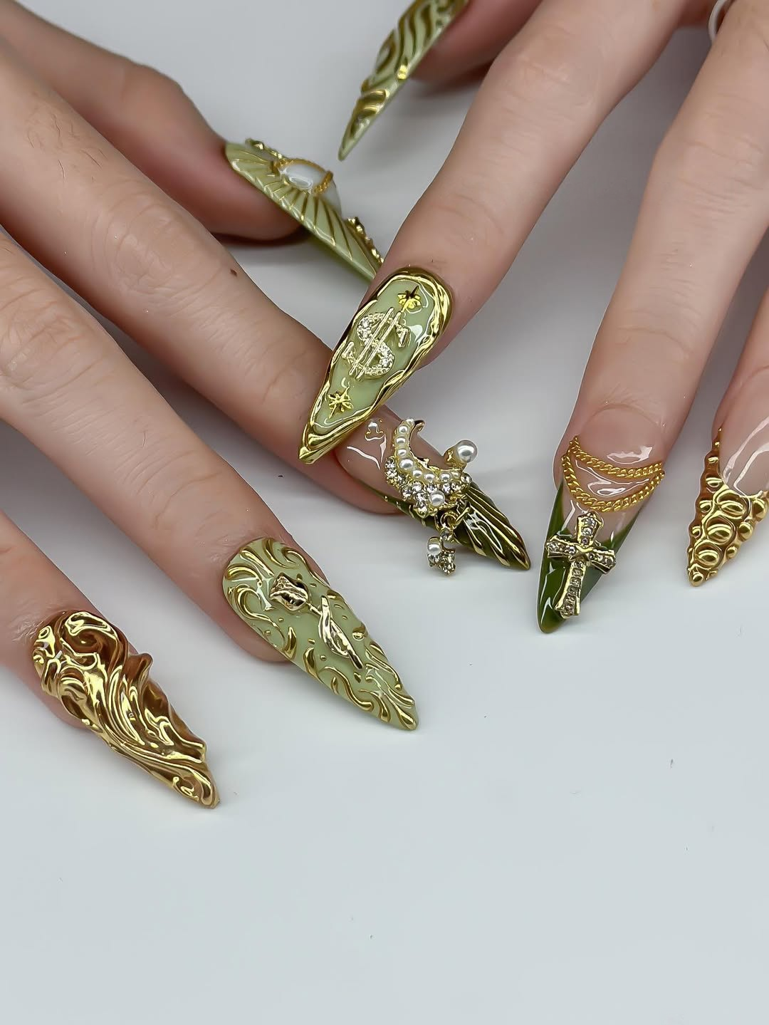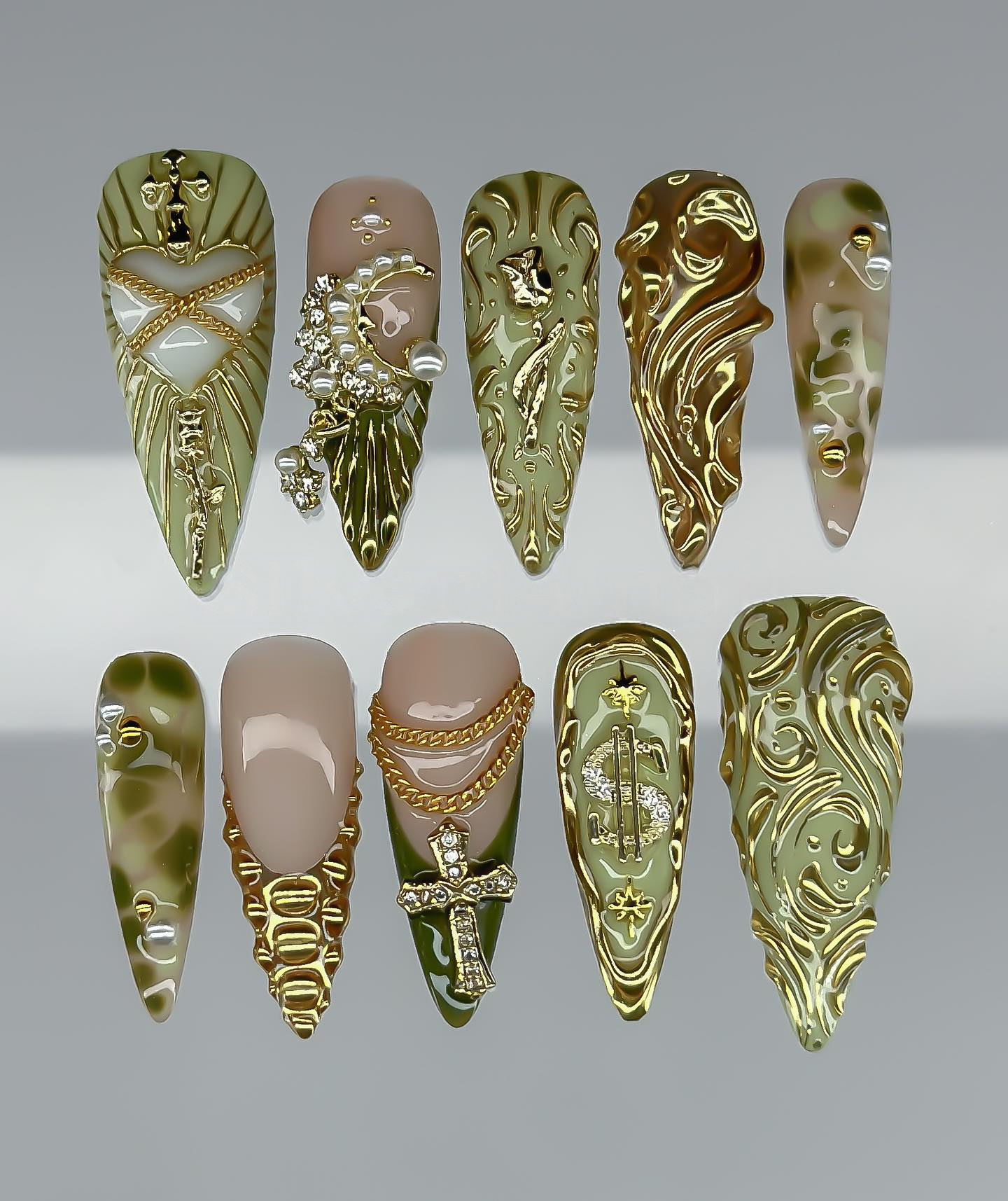 This opulent collection features a sophisticated olive and sage green palette, enriched by intricate 3D golden filigree and high-fashion religious iconography. Every nail is a masterpiece of detail, from the diamond-encrusted crosses and heavy gold chains to the delicate crescent moon and floral engravings. The aesthetic perfectly captures the Royal Cyber-Baroque style—blending historical elegance with a futuristic, maximalist edge. It is the ultimate statement piece for those who want to express a powerful, divine, and deeply artistic "gu" that commands attention.