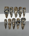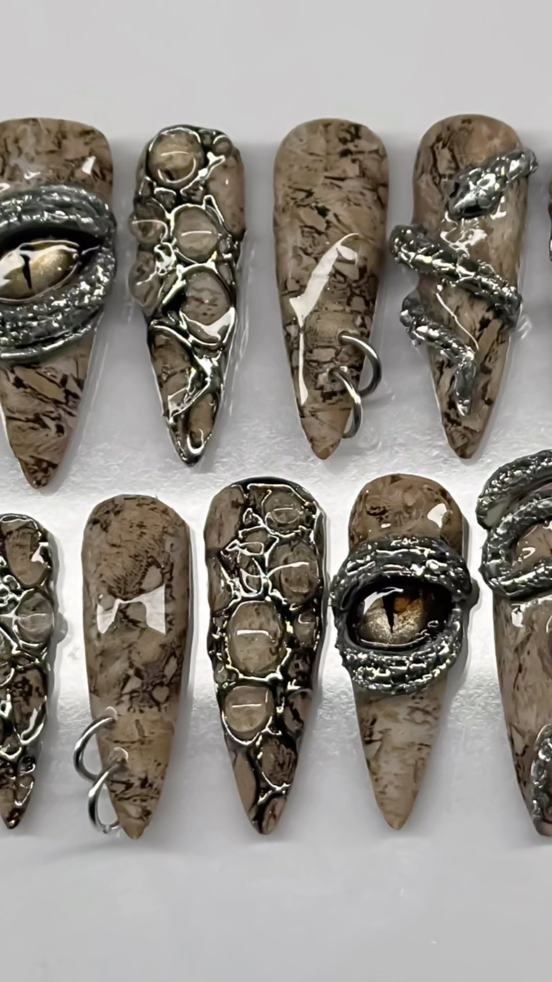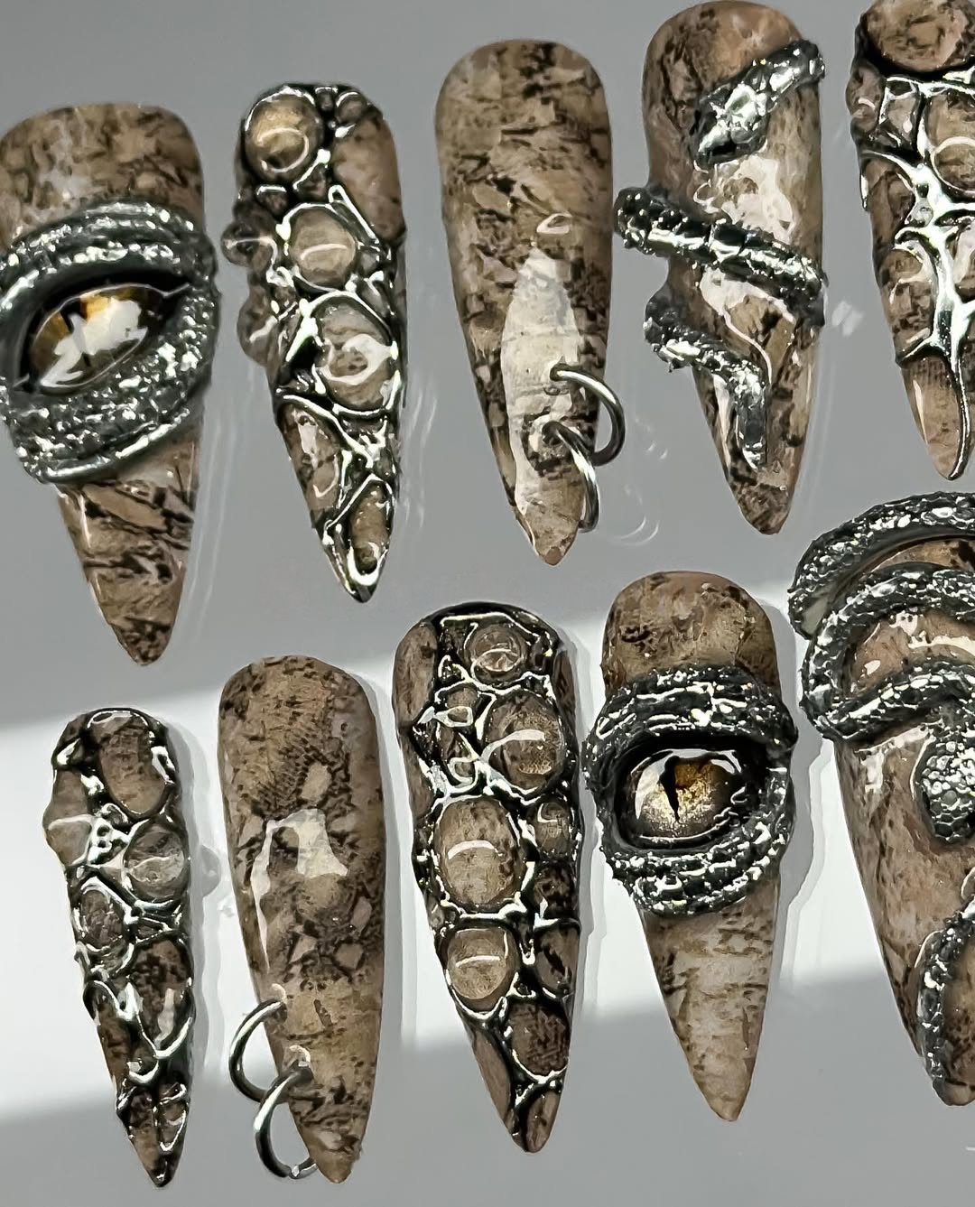 A breathtaking and edgy collection featuring realistic reptile-skin textures and mesmerizing 3D "dragon eye" accents that seem to watch your every move. The earthy, organic base is elevated by silver-toned serpent charms and liquid-metal scales, creating a stunning Primal Gothic vibe. Every detail is hand-sculpted to provide a sense of ancient mystery, perfect for those who want to express their fierce, artistic, and predatory soul.