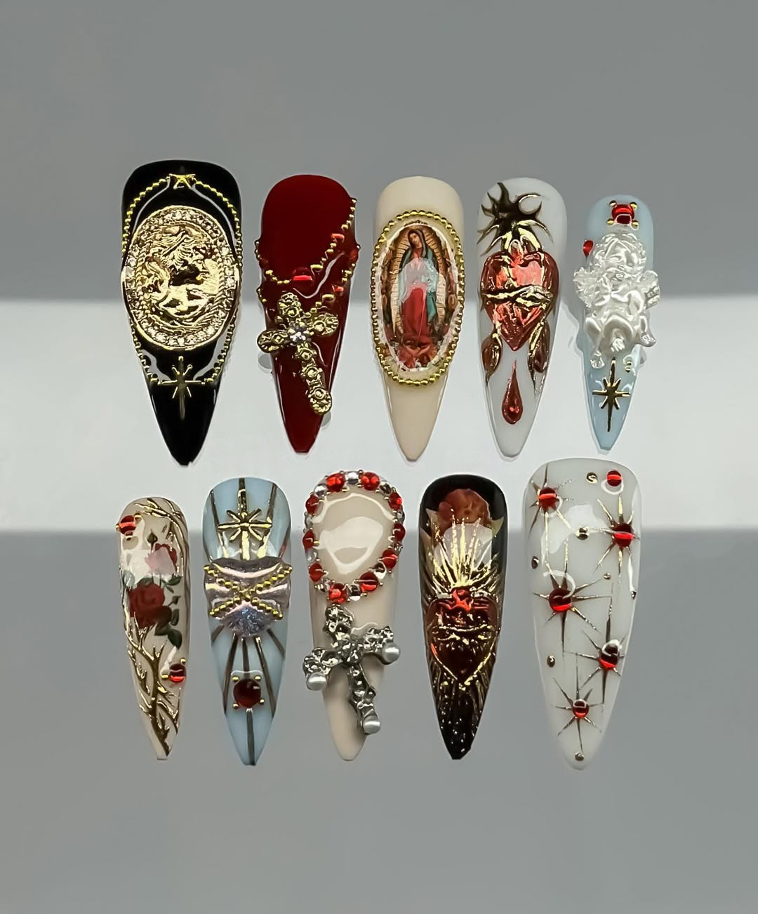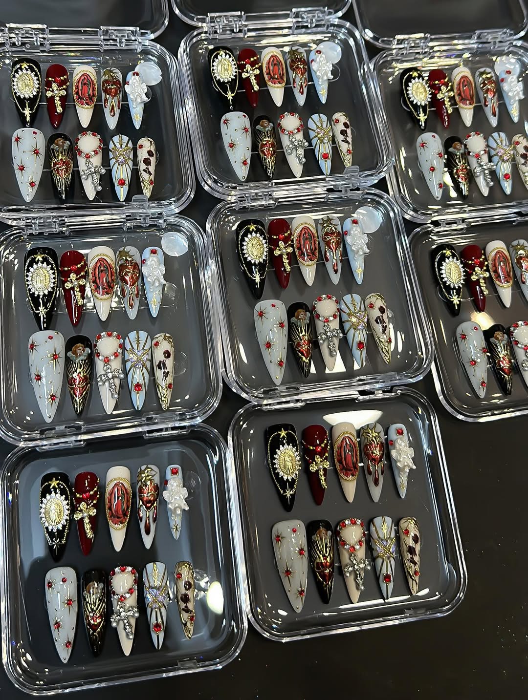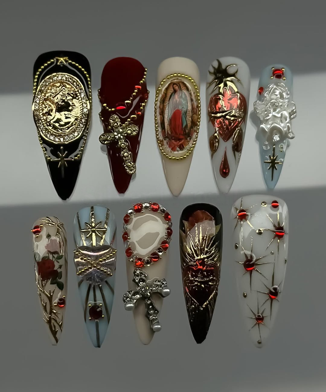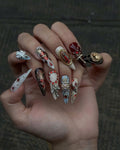 The Ultimate Statement of Edgy Elegance. Step into the world of dark romance with the Velvet Soul Art set. Inspired by the mysterious beauty of Gothic aesthetics and the intricate details of Baroque art, this set is more than just nails—it’s wearable art for the bold and the beautiful. Each nail is meticulously hand-painted by our artisans in Vietnam, featuring a deep, moody palette accented with ornate charms and vintage-inspired textures. Whether you're heading to a special event or just want to elevate your everyday look, these nails will make you the main character.