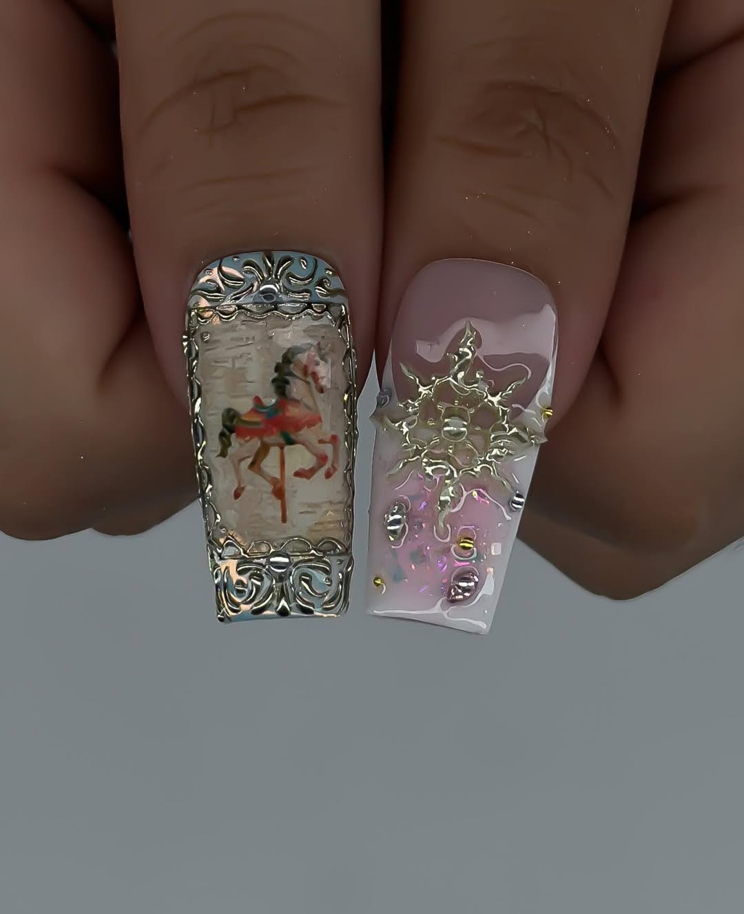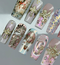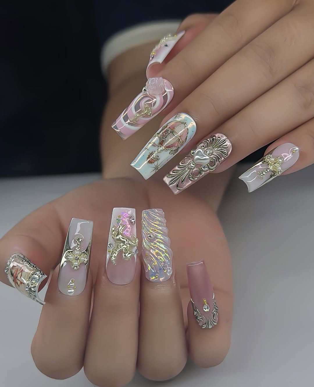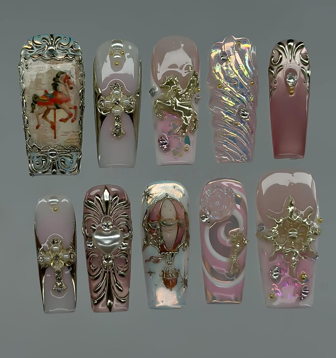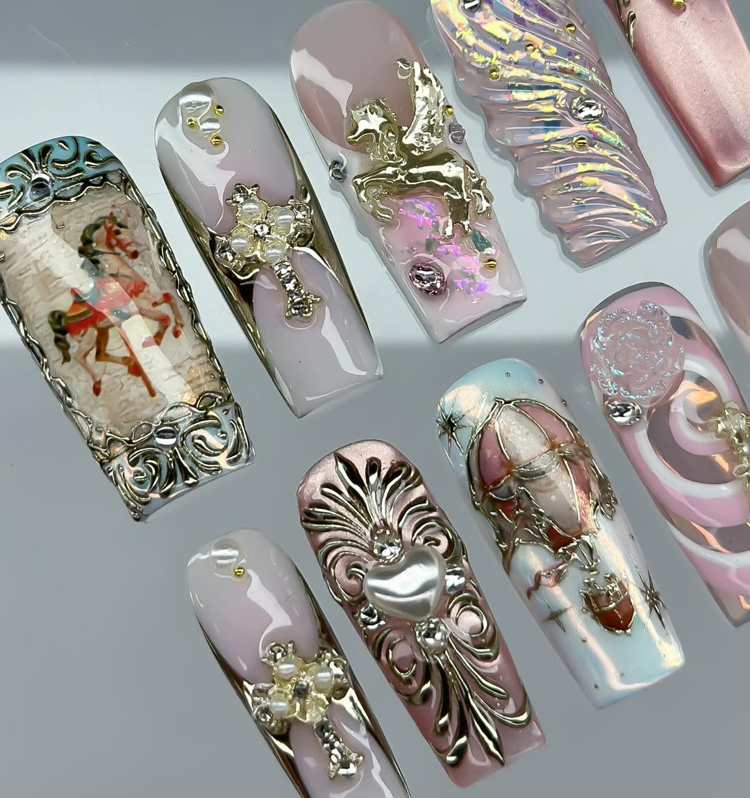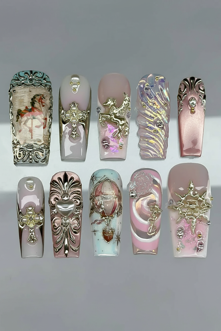 This whimsical collection features a soft palette of blush pink, baby blue, and pearlescent white, creating a nostalgic and dreamy foundation. The design is meticulously detailed with hand-painted vintage carousel horses, hot air balloons, and delicate floral wreaths that evoke a sense of childhood wonder. Exquisite 3D sculpted gold filigree and "liquid metal" frames surround the artwork, adding a layer of regal, antique luxury to each nail. Premium charms, including pearl-encrusted crosses, golden pegasus figures, and shimmering crystal stars, are strategically placed to enhance the maximalist aesthetic. The overall style masterfully blends Victorian Storybook charm with a modern Baroque flair, transforming your hands into a wearable gallery of fine art. These high-relief textures and polished gold finishes offer a luxurious tactile experience and a visually captivating presence for special occasions. The long coffin and square shapes provide an elegant silhouette, making this set an ideal statement piece for formal tea parties or themed editorial photography.
