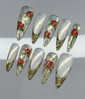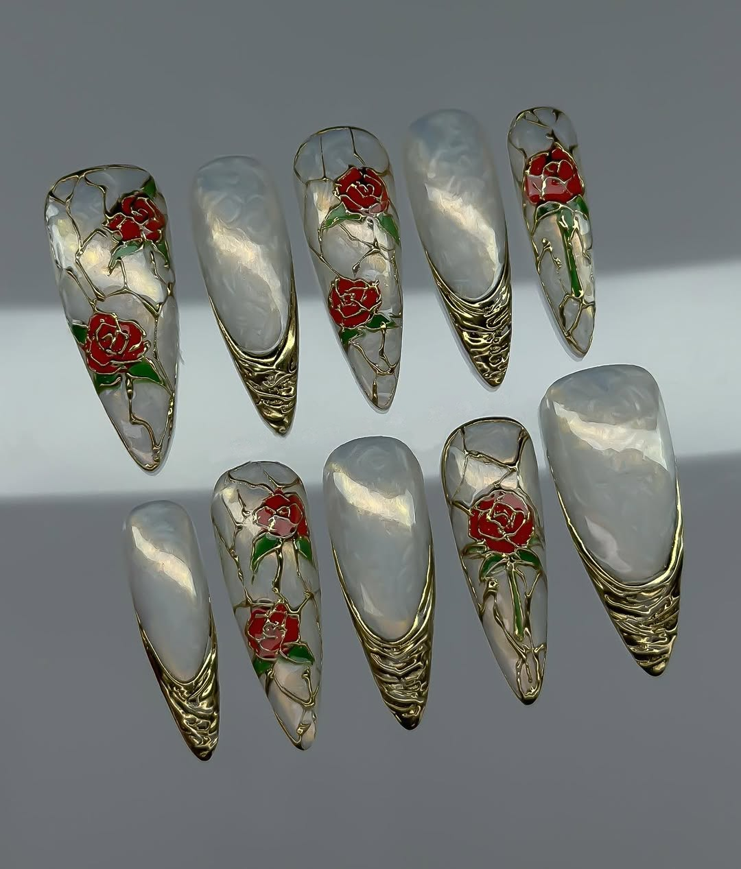 This opulent set features a luminous pearlescent white base adorned with vibrant ruby red roses and deep emerald green leaves. The design is meticulously detailed with intricate gold "lead" lines, mimicking the sophisticated beauty of antique stained glass windows. Each nail is framed by hand-sculpted 3D gold textures at the tips, adding a regal and tactile luxury to the collection. Delicate golden vines wind across the surface, connecting the floral motifs into a cohesive botanical gallery. The overall aesthetic masterfully blends Gothic Victorian elegance with a modern Baroque flair, creating a truly majestic presence. These high-relief textures and polished finishes are perfectly suited for formal events, weddings, or high-fashion editorial photography. It is the ultimate statement piece for those seeking to embody timeless grace and artistic sophistication.