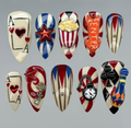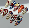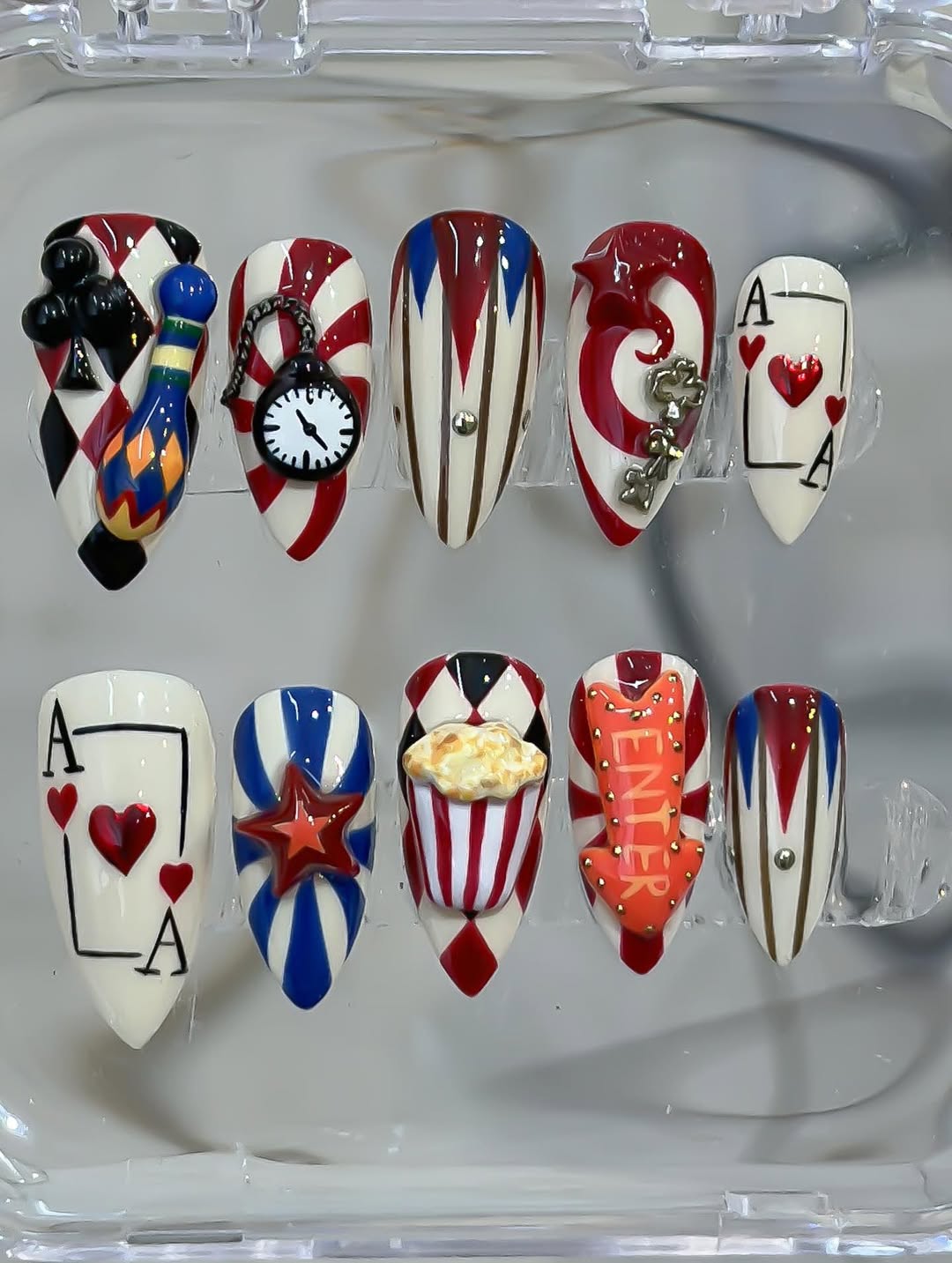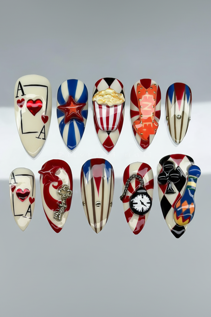 This playful short press-on set features a nostalgic palette of ivory cream, carnival red, and bold royal blue. The design is meticulously detailed with hand-painted circus stripes, diamond harlequin patterns, and vintage card motifs. Striking 3D charms, including a miniature popcorn bucket, a golden "Enter" sign, and a classic pocket watch, are integrated to provide whimsical structural depth. The overall aesthetic masterfully fuses Retro Americana charm with a creative Pop-Art flair, transforming each fingertip into a wearable attraction. These vibrant details and durable finishes make them perfect for themed parties, creative photoshoots, or adding a bold, joyful statement to your everyday look.